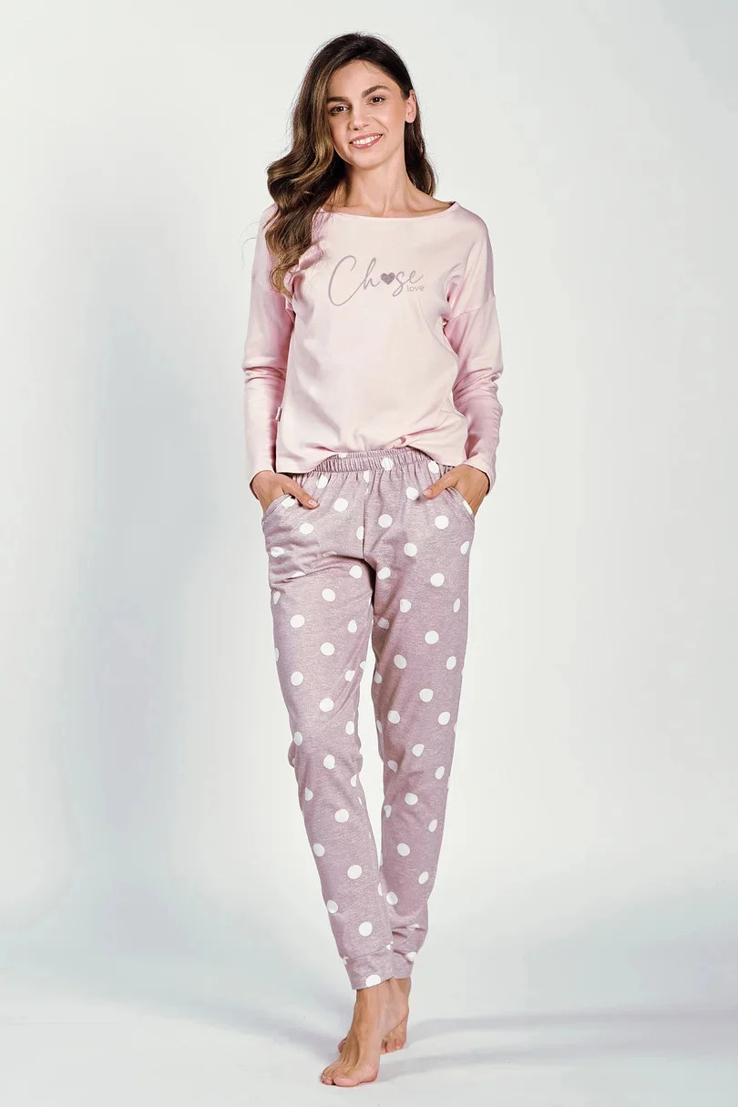 Dámské pyžamo s dlouhými rukávy, vpředu zdobené potiskem, doplněné vzorovanými dlouhými kalhotami s kapsami.