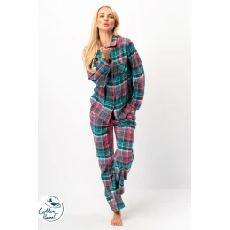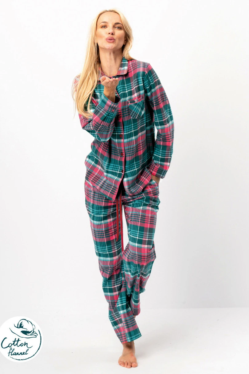 Piżama damska z miękkiej bawełny flanelowej to idealny wybór na chłodne wieczory i zimowe poranki. Klasyczna góra w formie koszuli zapinanej na guziki z kołnierzykiem i kieszonką na piersi zapewnia elegancki, ponadczasowy wygląd, a jednocześnie wygodę noszenia. Spodnie z prostą nogawką i regulowanym pasem gwarantują swobodę ruchów i komfort podczas snu. Wzór w zielono-czerwoną kratę dodaje przytulnego, świątecznego charakteru. Ten komplet to doskonałe połączenie funkcjonalności, ciepła i kobiecego stylu – sprawdzi się zarówno do spania, jak i domowego relaksu.