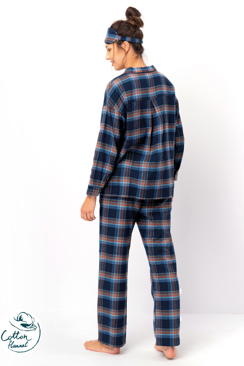 Piżama damska z miękkiej bawełny flanelowej to idealny wybór na zimowe wieczory i poranki. Wzór w elegancką granatowo-brązową kratę nadaje jej klasycznego, ponadczasowego charakteru. Góra w formie koszuli zapinanej na guziki posiada kołnierzyk i kieszonkę na piersi, łącząc wygodę z estetyką. Spodnie o prostym kroju i elastycznym pasie gwarantują swobodę ruchów i komfort podczas snu. W zestawie znajduje się dopasowana opaska na oczy, która pozwala cieszyć się spokojnym, nieprzerwanym snem. To komplet łączący praktyczność, ciepło i kobiecy styl.