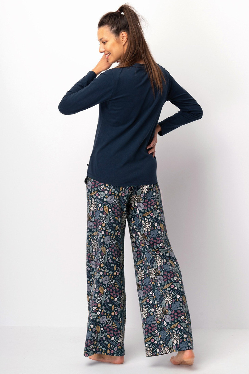 Piżama damska LNS 571 B25 to wygodny i stylowy komplet, który łączy naturalne materiały z modnym wzornictwem. Uszyta z przyjemnej w dotyku dzianiny (95% bawełna, 5% elastan), zapewnia komfort noszenia i pełną swobodę ruchów. Koszulka z długim rękawem, półokrągłym dekoltem i kolorowym nadrukiem roślinnym z przodu dodaje zestawowi świeżości i kobiecego charakteru. Spodnie o długiej, luźnej i rozszerzanej nogawce wyróżniają się wzorzystym designem, a praktyczne kieszenie po bokach zwiększają ich funkcjonalność. Gumka w pasie z wiązaną tasiemką umożliwia idealne dopasowanie. To doskonała piżama dla kobiet, które cenią swobodny krój i stylowy wygląd także w domowym zaciszu.