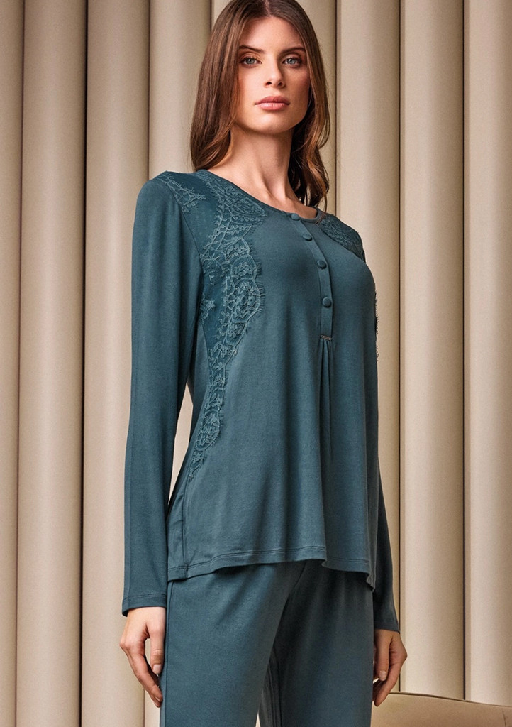 Dámské pyžamo od značky Lormar je vyrobené z mimořádně jemného a příjemného materiálu, který poskytuje celodenní komfort. Horní díl má dlouhé rukávy, elegantní zapínání na knoflíčky a je zdobený jemnou krajkovou aplikací po stranách, která dodává celému setu ženský a sofistikovaný vzhled. Střih je volnější a pohodlný. Kalhoty mají rovný střih zakončený pružnými manžetami, díky kterým skvěle sedí a nevyhrnují se. Pyžamo je ideální na každodenní nošení i klidné večery doma.