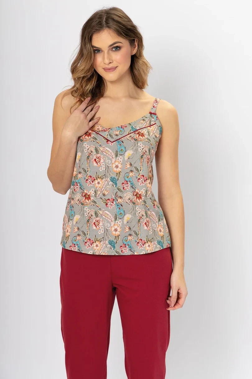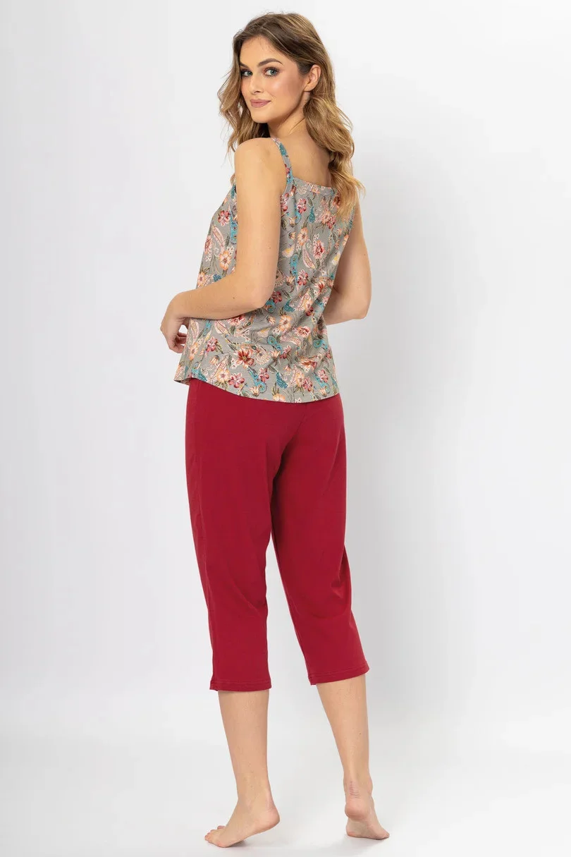 Dámské pyžamo z vysoce kvalitní bavlny. Vzorované tričko s úzkými ramínky doplněné kalhotami v rybářském stylu.