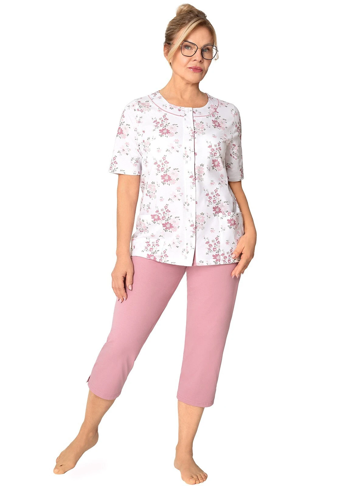 Blůza pyžama má krátké rukávy a je ozdobená květinovým vzorem. Půlkulatý výstřih se zapíná knoflíčky. Hladké kalhoty mají 3/4 délku. Střih a vzhled pyžama zachycují první čtyři fotografie.