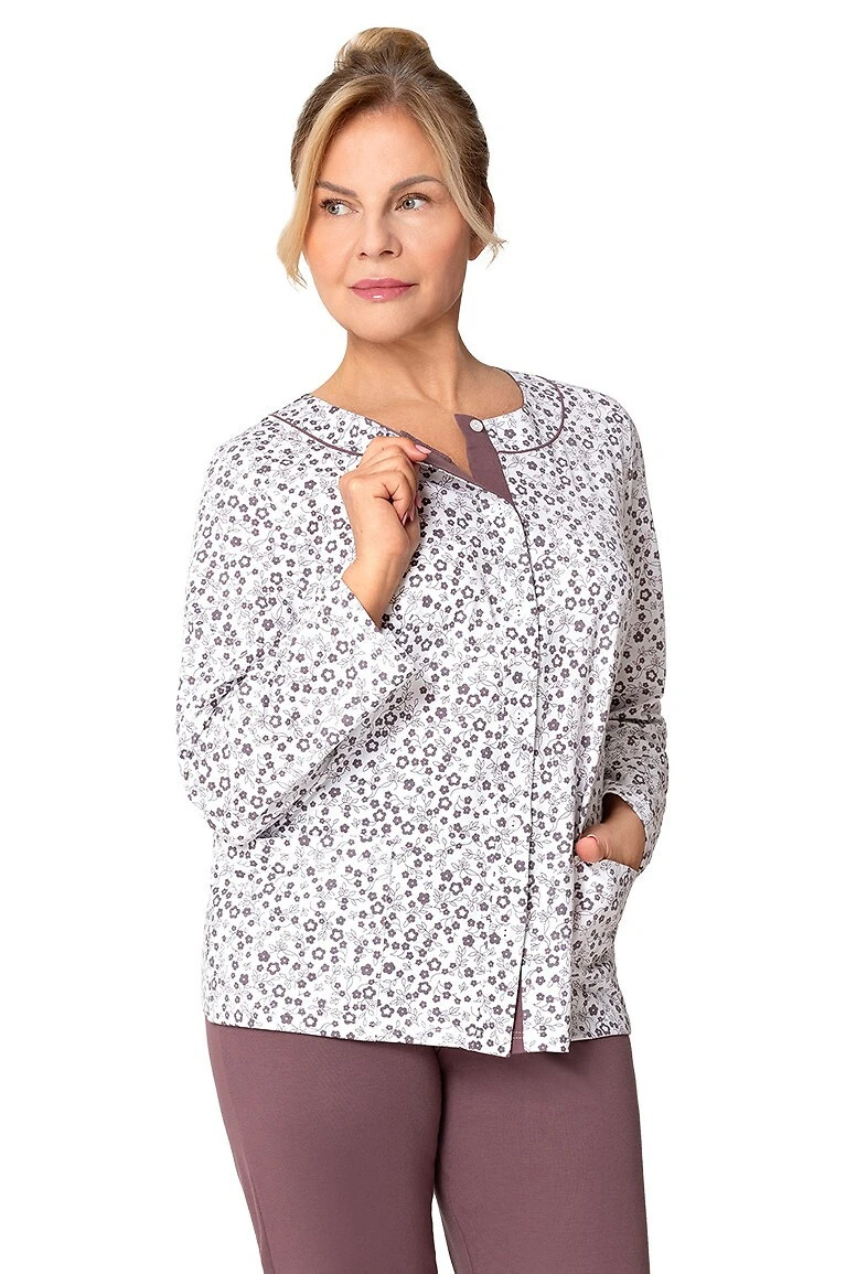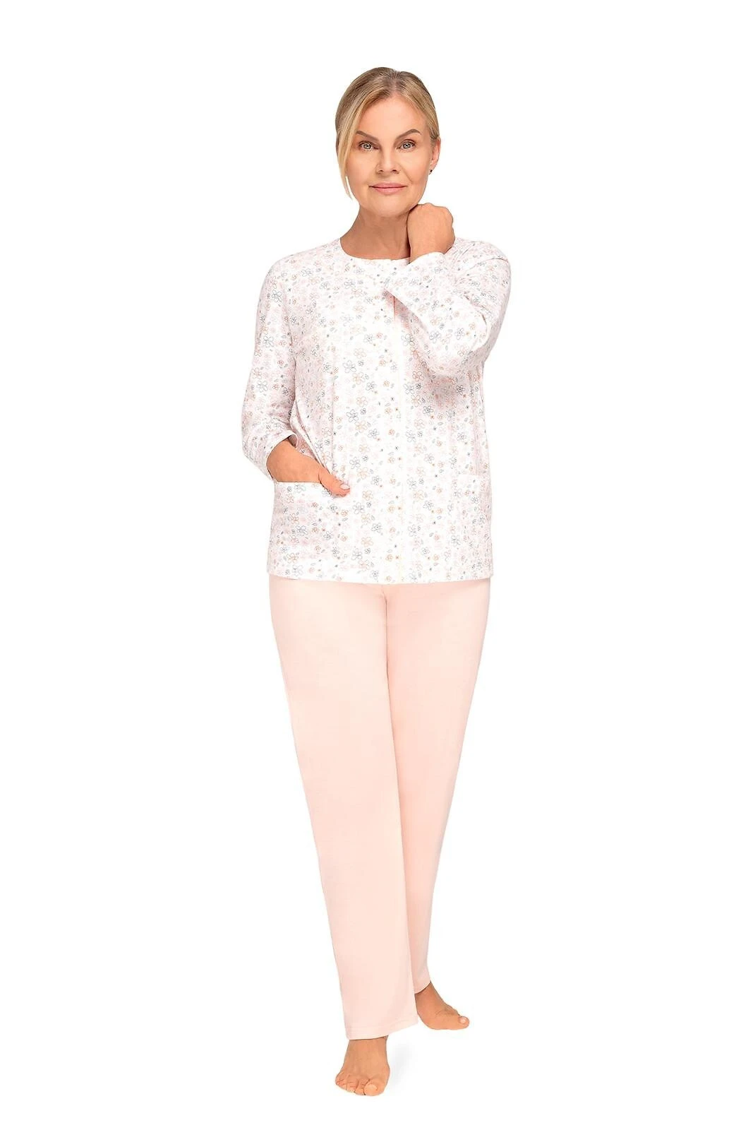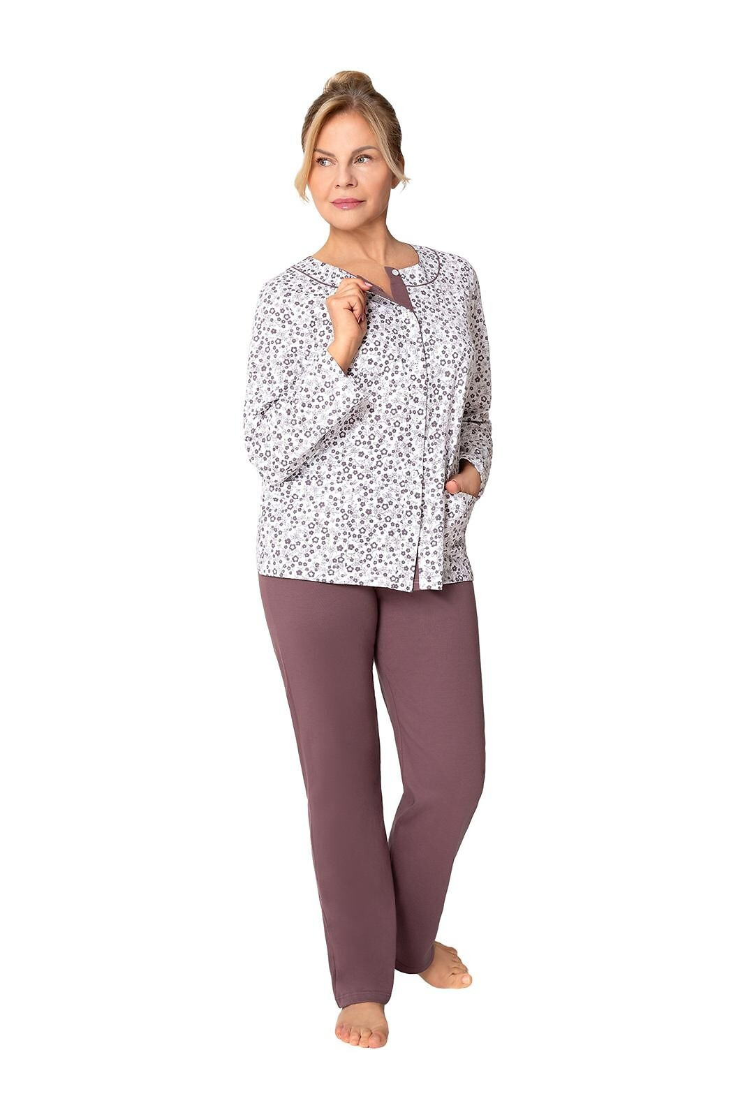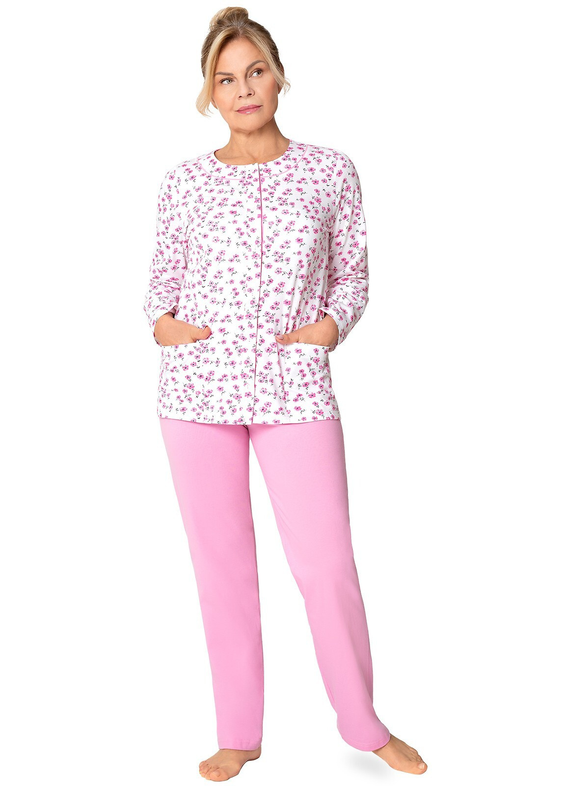Vzorovaná blůza pyžama má dlouhé rukávy, kulatý výstřih a rozepíná se. Jednobarevné kalhoty s dlouhými nohavicemi mají v pase gumu.