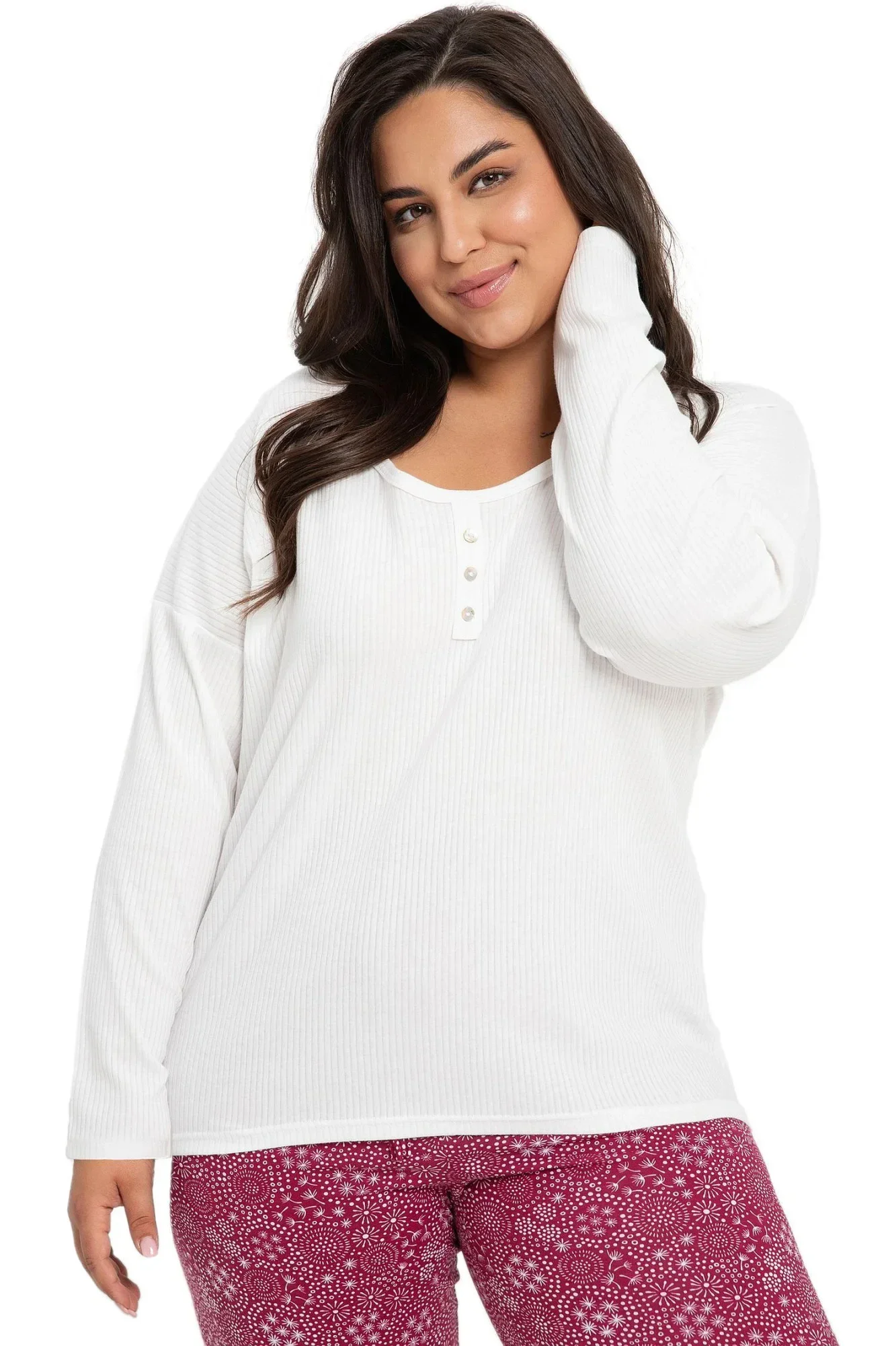Dámské pyžamo 3005 Estella Taro - vyrobené z vysoce kvalitní a měkké bavlny - tričko je bílé barvy s dlouhými rukávy - půlkulatý výstřih s knoflíky - vzorované capri kalhoty