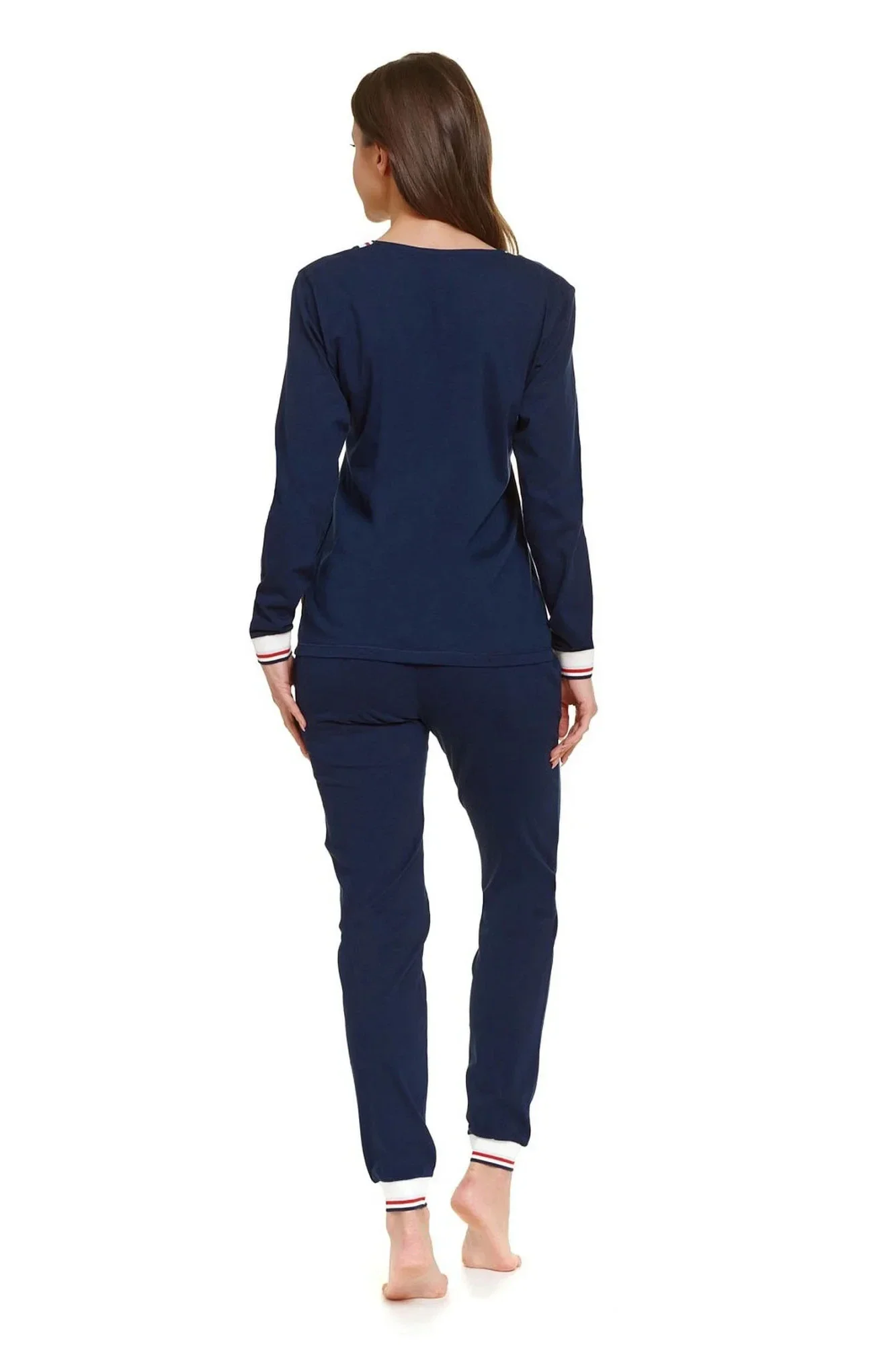 Dámské pyžamo 4504 Doctor Nap - vyrobené z velmi kvalitní a příjemné bavlny - tmavě modré tričko s dlouhými rukávy - na přední straně ozdobené potiskem - kontrastní lemování manžet a výstřihu - dlouhé tmavě modré kalhotyMateriálové složení: 100% bavlna