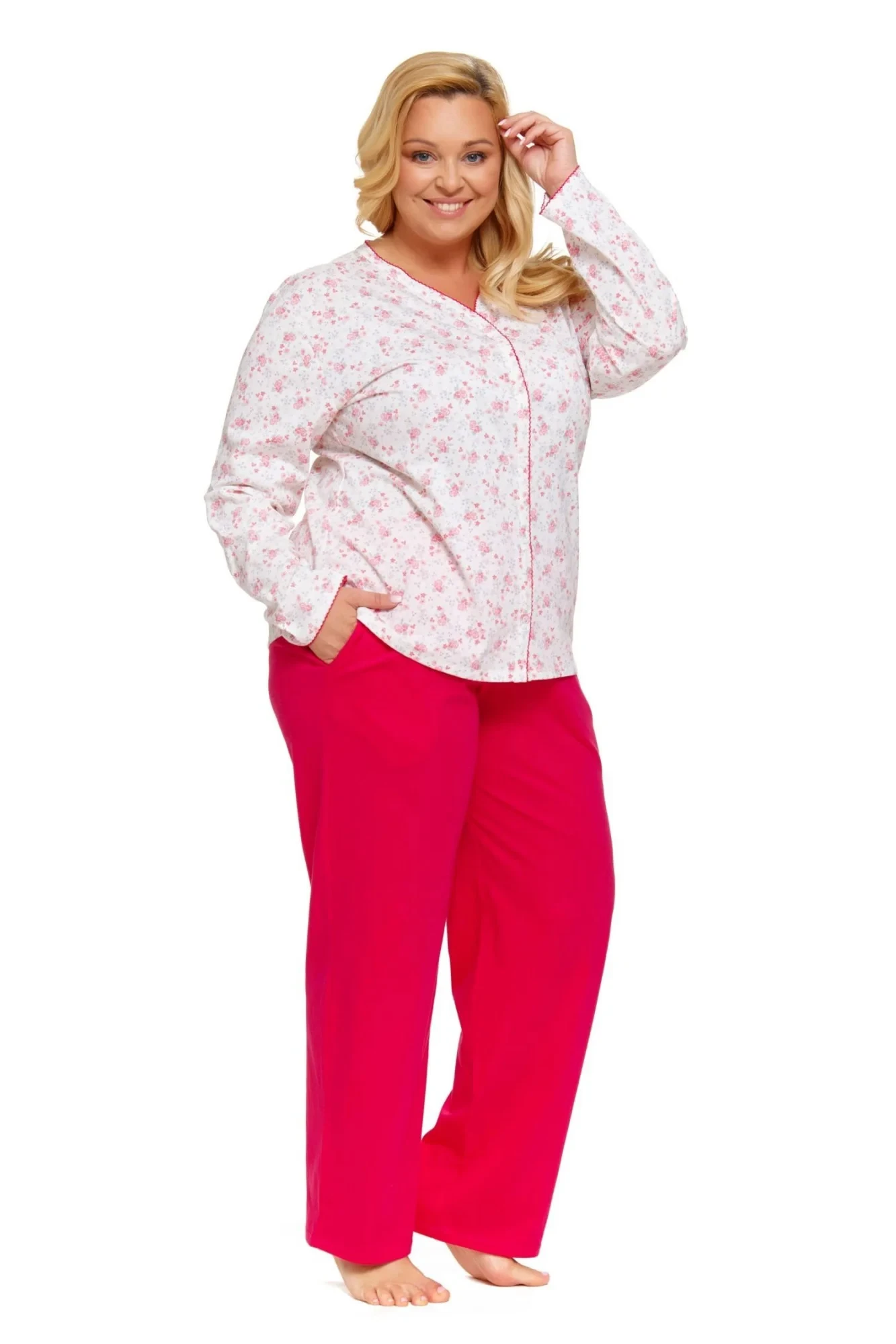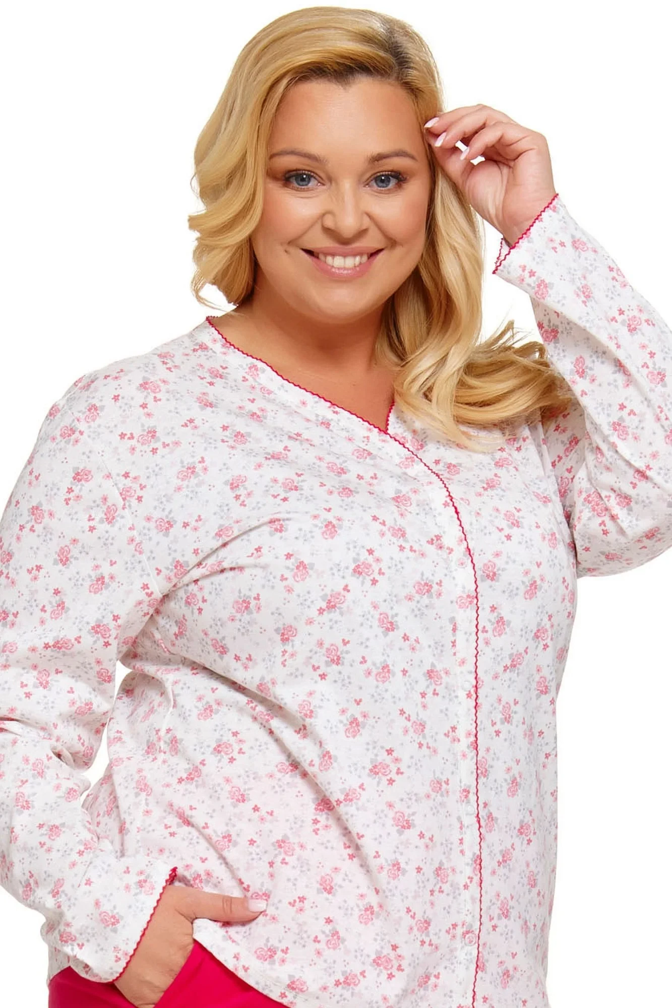 Dámské pyžamo 5282 Doctor Nap - vyrobené z velmi kvalitní a příjemné bavlny - bílá košile na zapínání a s dlouhými rukávy - s růžovým květinovým potiskem - dlouhé červené kalhoty - certifikát OEKO-TEX Standard 100