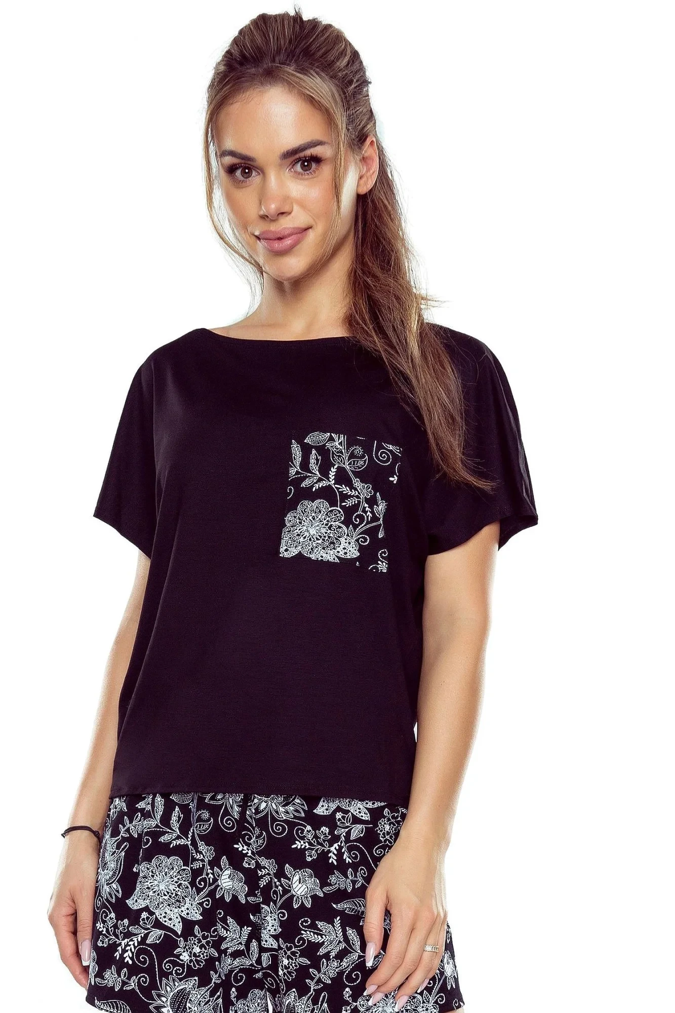 Dámské pyžamo Silvana ELDAR - černá barva - z vysoce kvalitní viskózy - krátký rukáv - vzorované kraťasyMateriálové složení: 95% viskóza + 5% elastan