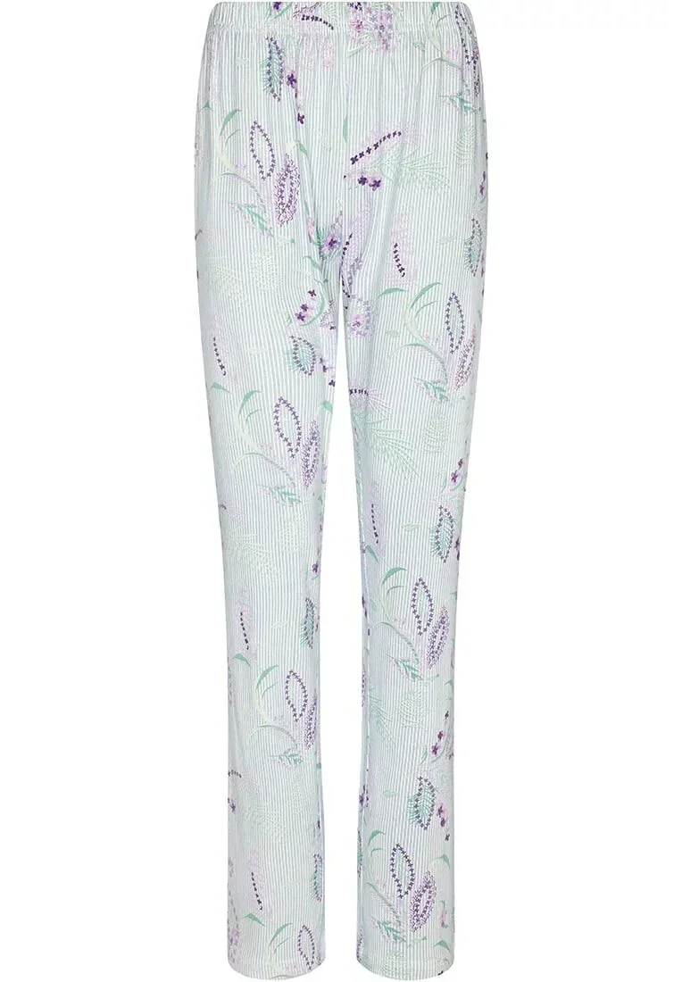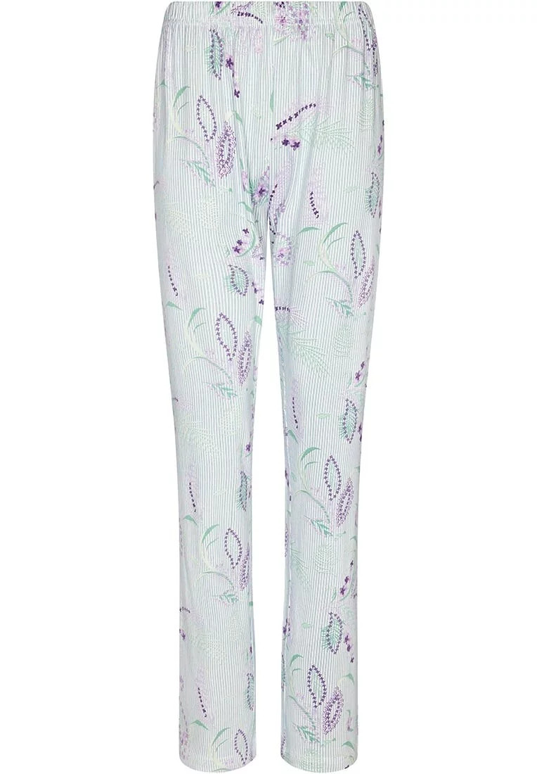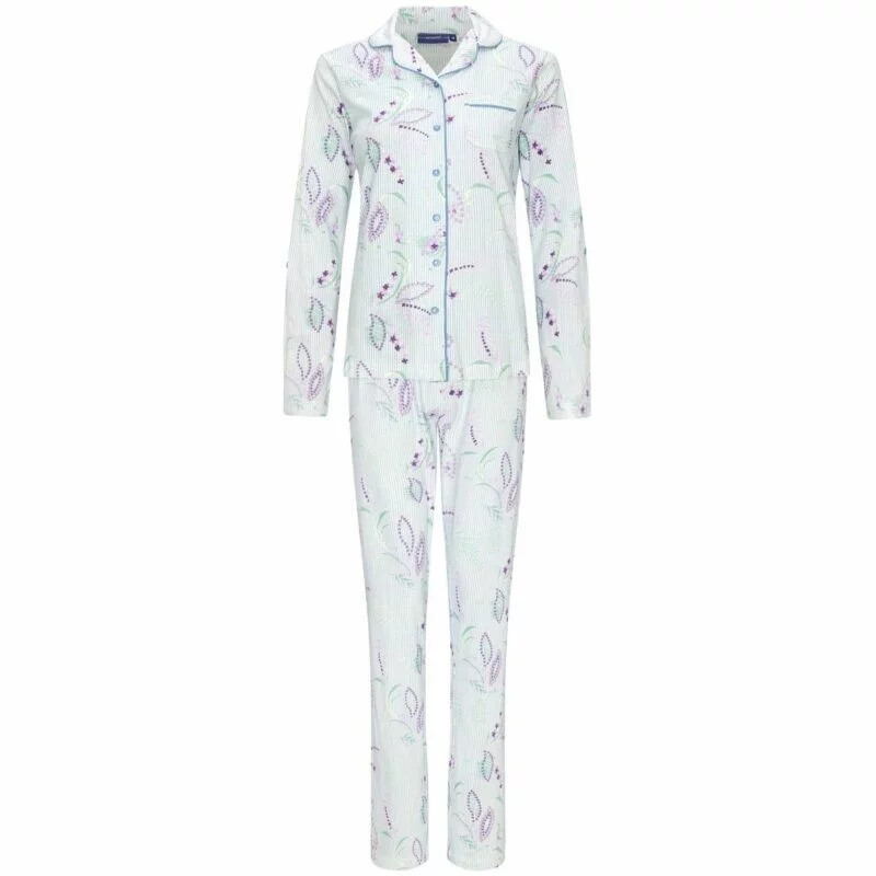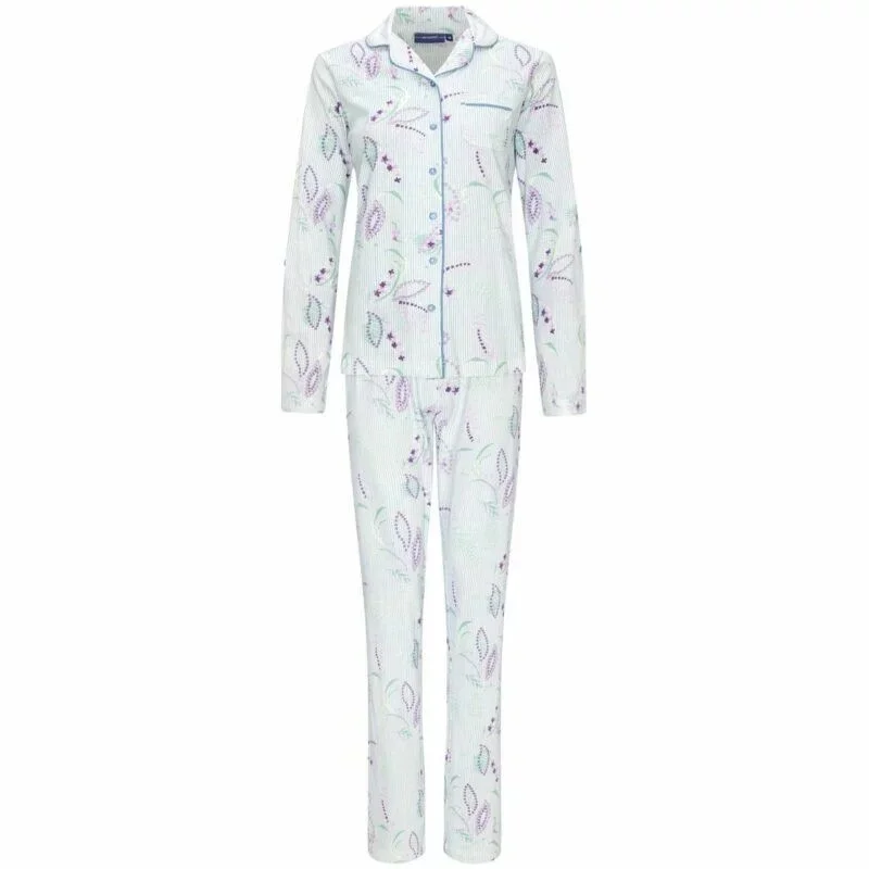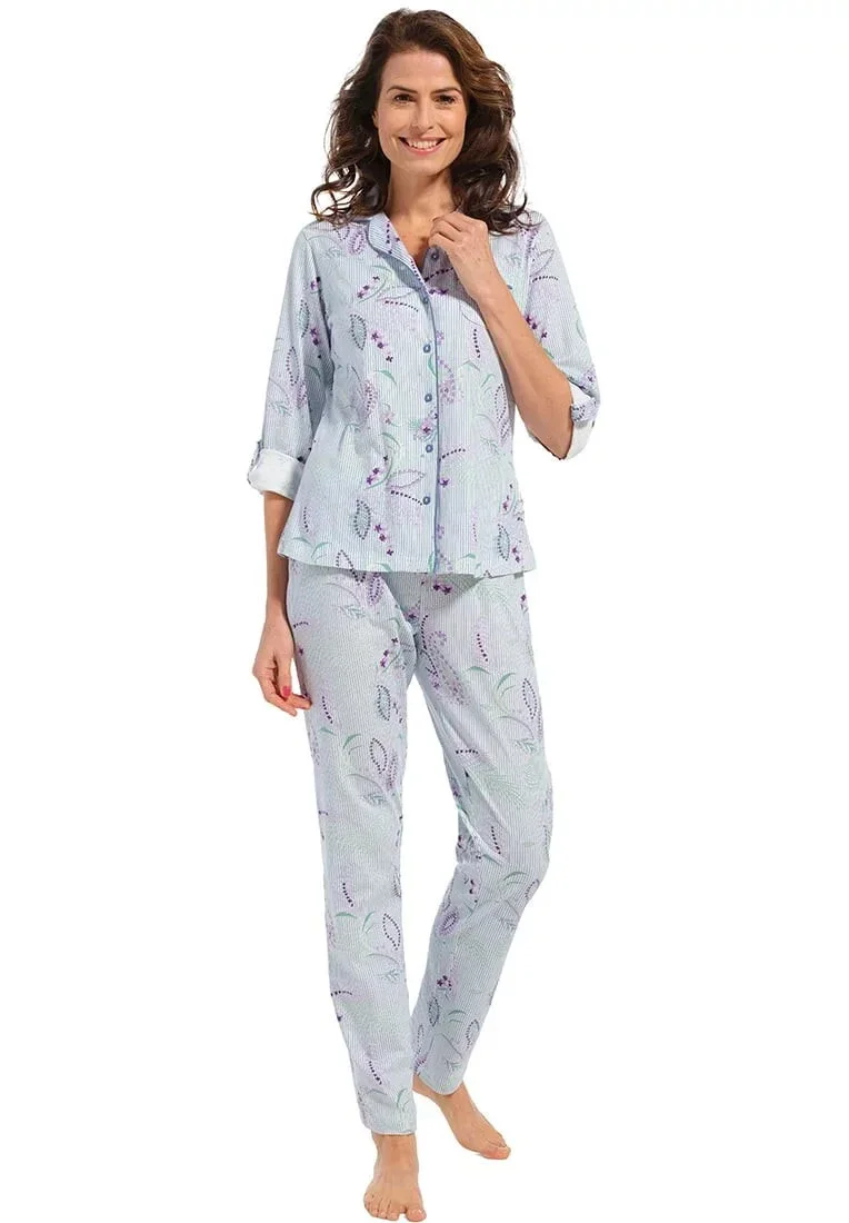 Tkanina je měkká a prodyšná pro příjemný spánek. Látka je udržitelná a vyrobená z přírodních vláken. Toto krásné dámské pyžamo s roztomilými modrými knoflíky na přední straně a klasickým límcem u krku si zamilujete. Kalhoty jsou zakončeny elastickým pasem pro maximální pohodlí.