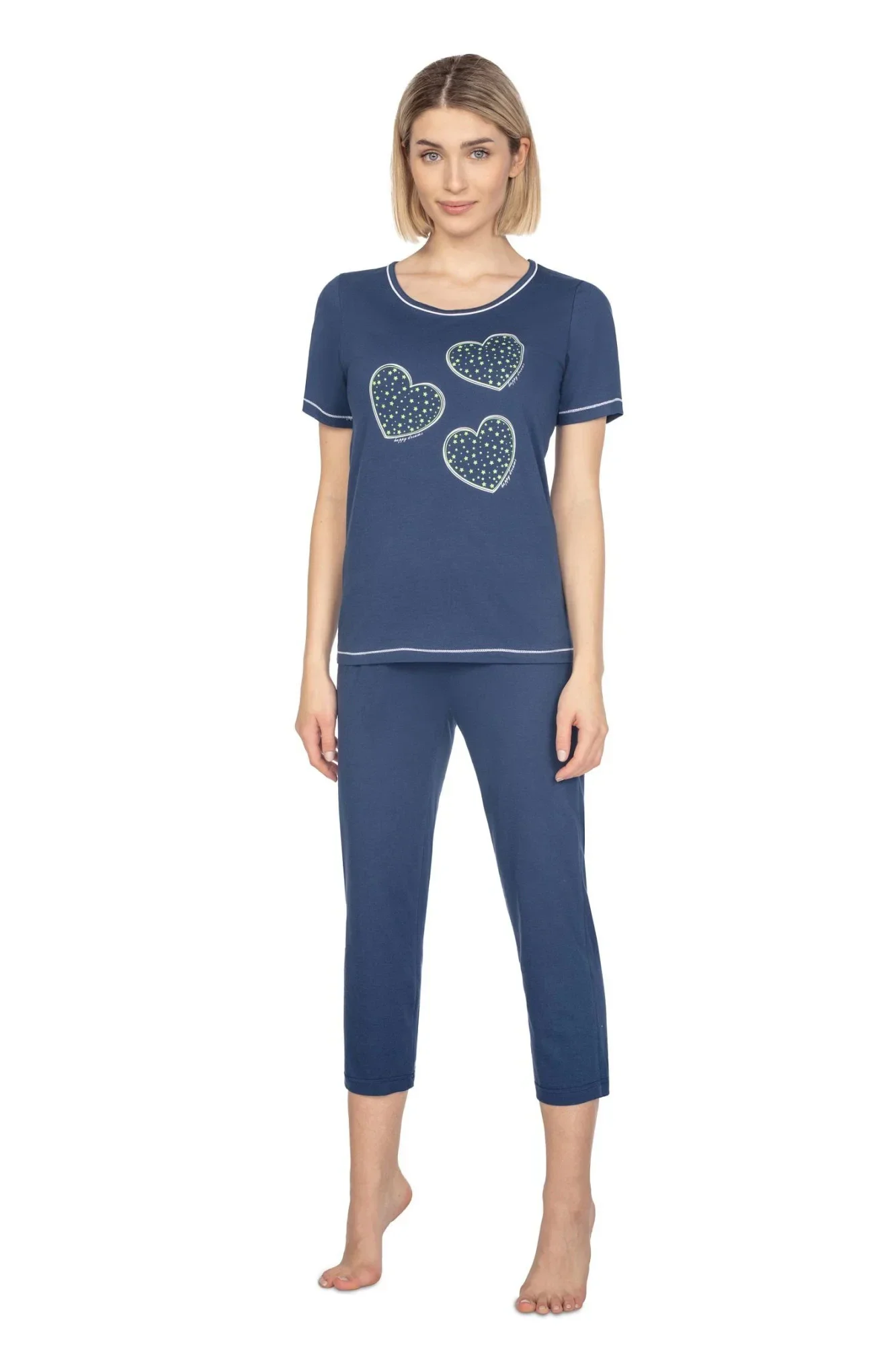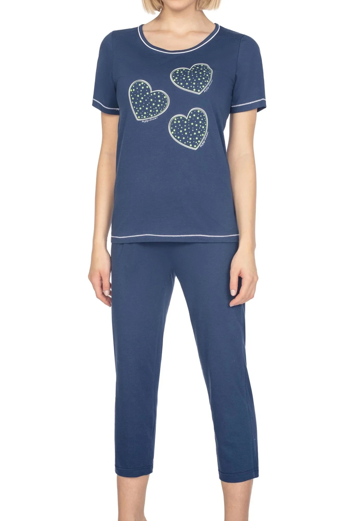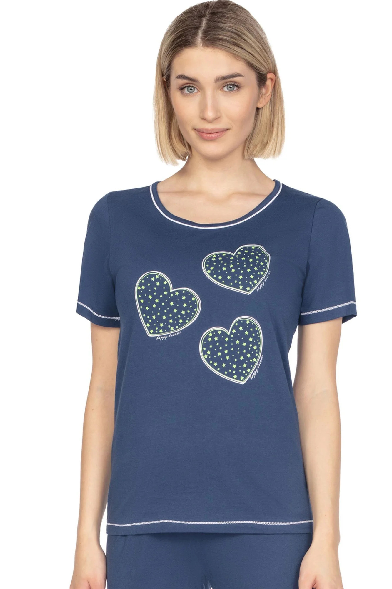 Dámské pyžamo 667 dark blue plus REGINA - z vysoce jakostní bavlny - světle modré tričko s krátkými rukávy - ozdobené srdíčky na přední straně - pohodlné jednobarevné kalhoty