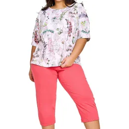Dámské pyžamo 3156 Olive TARO - z vysoce jakostní bavlny - tričko je bílé barvy s krátkými rukávy - zdobené květinovým vzorem - jednobarevné kalhoty