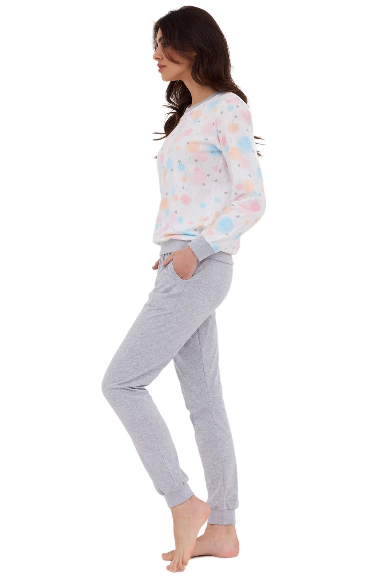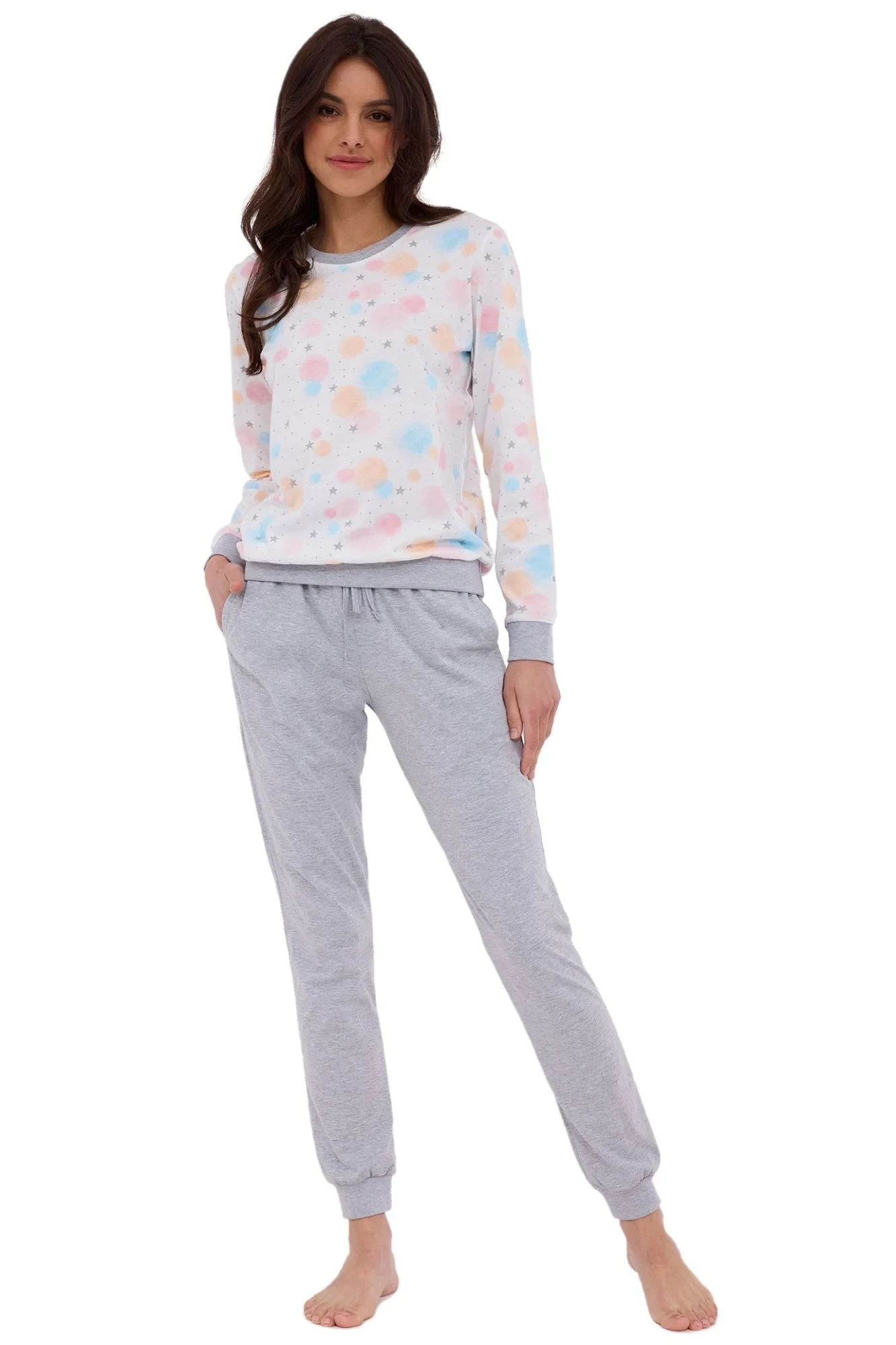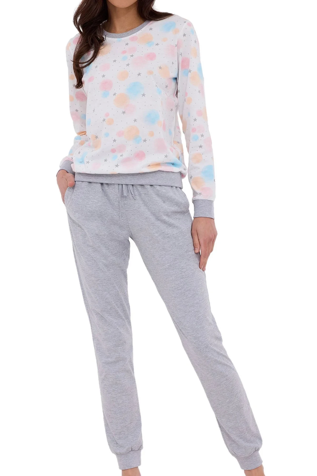 Dámské pyžamo 740/379 Star 2 CORNETTE - z vysoce jakostní bavlny - bílé tričko s dlouhými rukávy - se vzorem - dlouhé šedé kalhoty - šedé lemování - v pase šňůrka - pyžamo je vhodné i na denní nošení