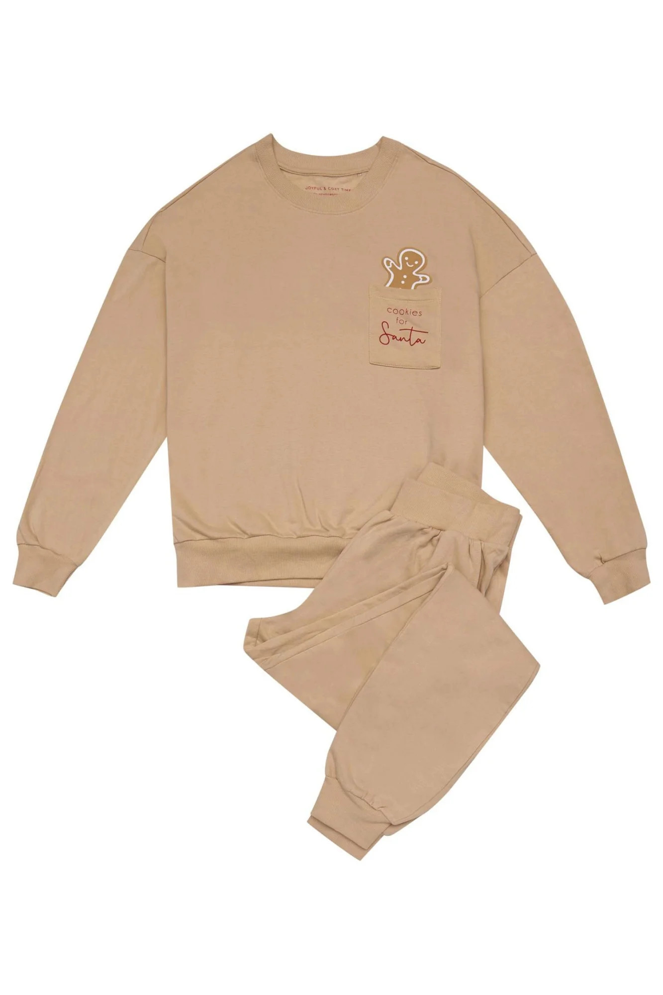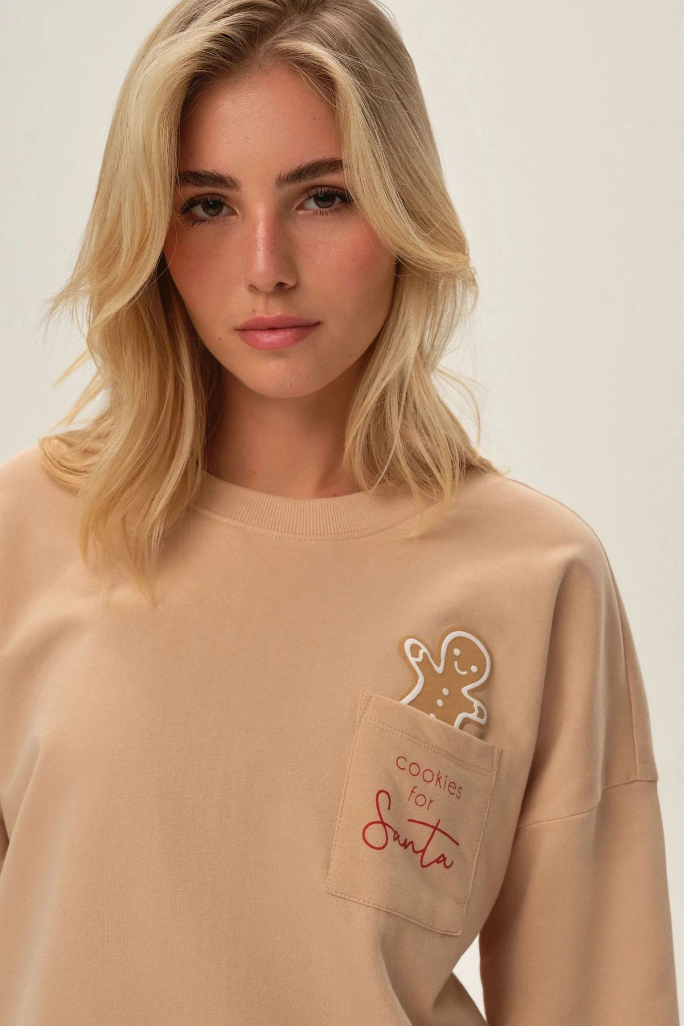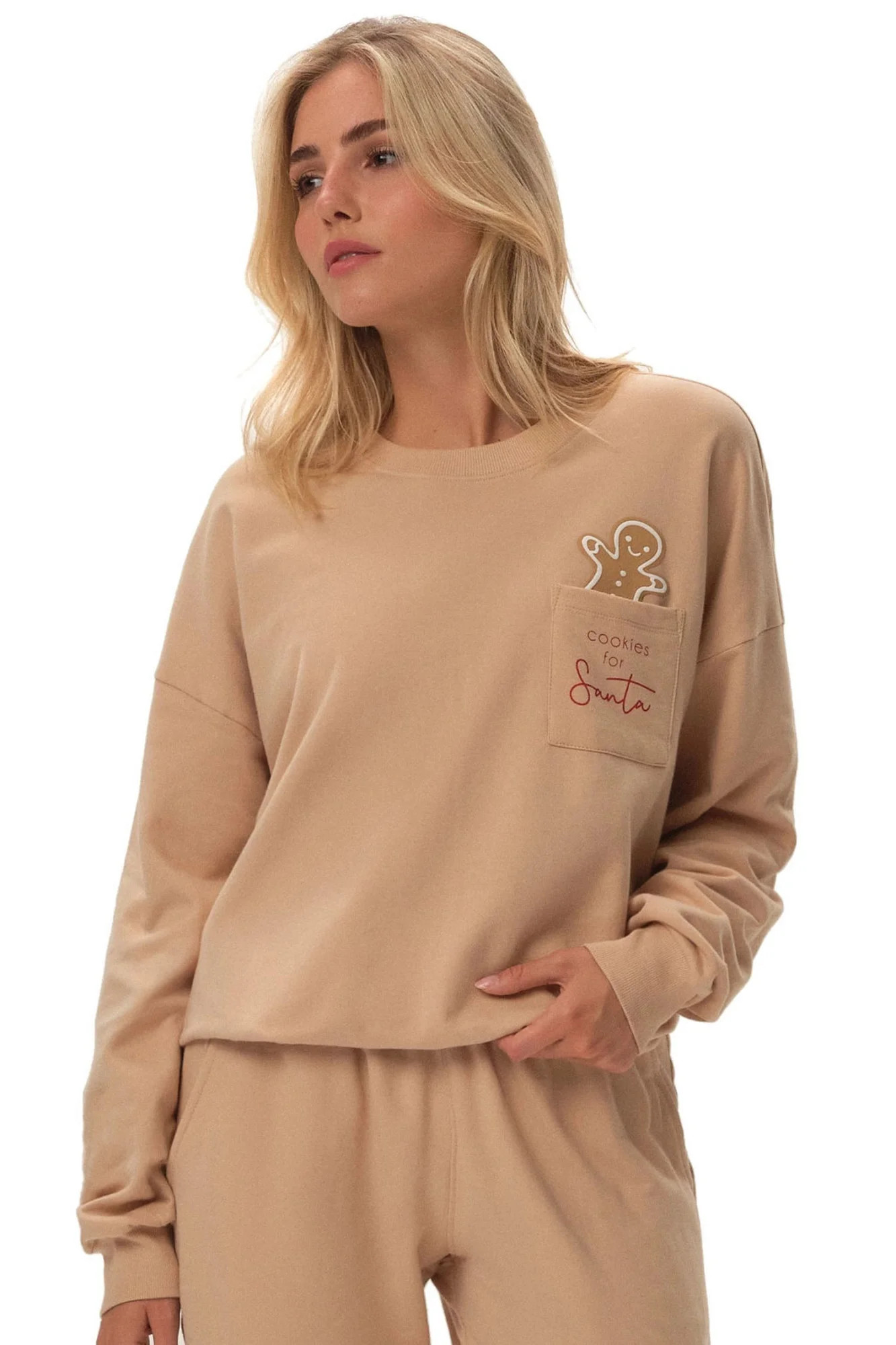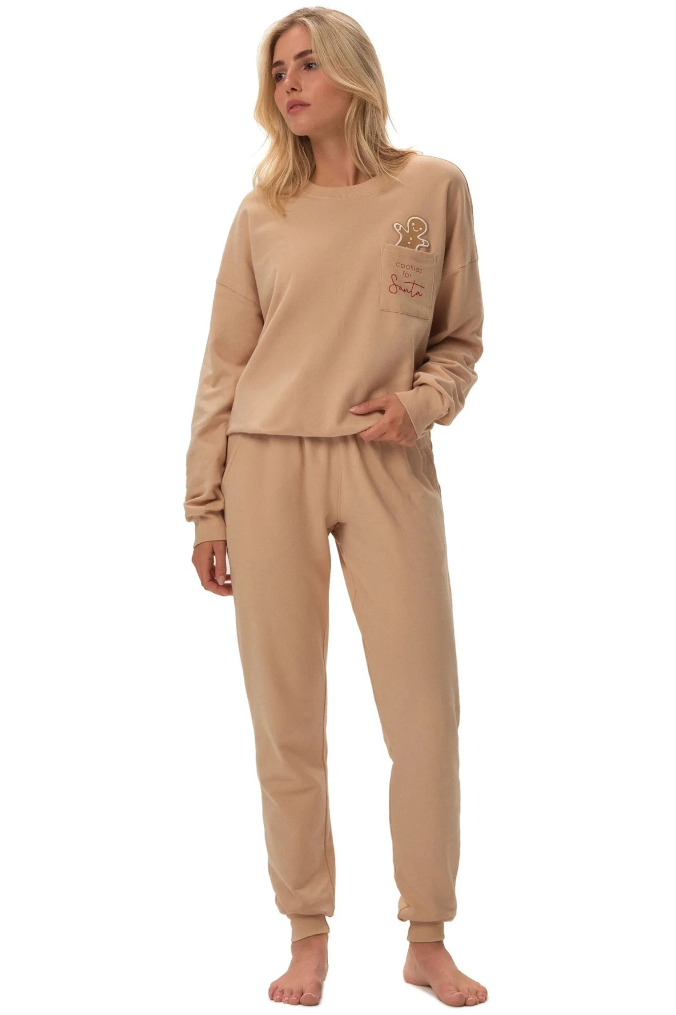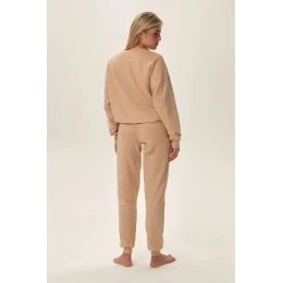 Dámské pyžamo 41899 Fawn HENDERSON - z vysoce jakostní bavlny - halenka béžové barvy s dlouhými rukávy - půlkulatý výstřih - na přední straně zdobená potiskem s kapsičkou - dlouhé kalhoty béžové barvy s kapsami - široký elastický pas - lemy nohavic a rukávů z žebrovaním