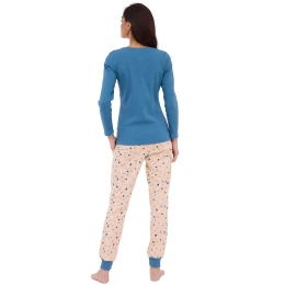 Dámské pyžamo 723/380 Sammy CORNETTE - z vysoce jakostní bavlny - světle modré tričko s dlouhými rukávy - výstřih se zapínáním na patentky - vzorované dlouhé kalhoty s kapsami - nohavice zakončené světle modrými manžetami