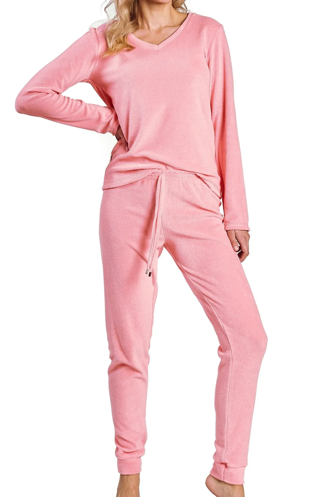 Dámské pyžamo 3244 Ruth TARO - z vysoce jakostní froté bavlny - tričko růžové barvy s dlouhými rukávy - ozdobené potiskem na přední straně - růžové dlouhé kalhoty - šňůrka v pase - rukávy i nohavice zakončené lemováním