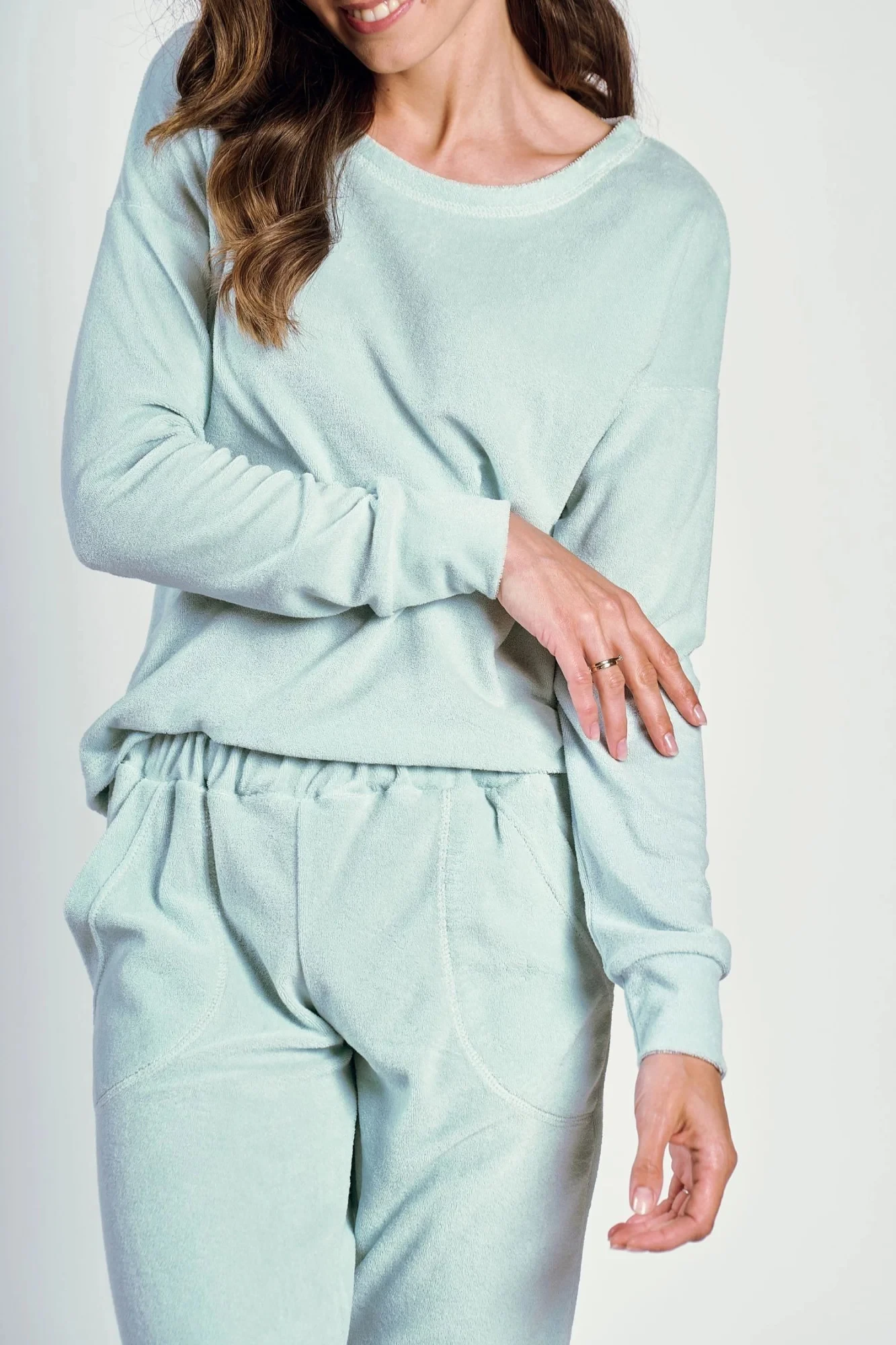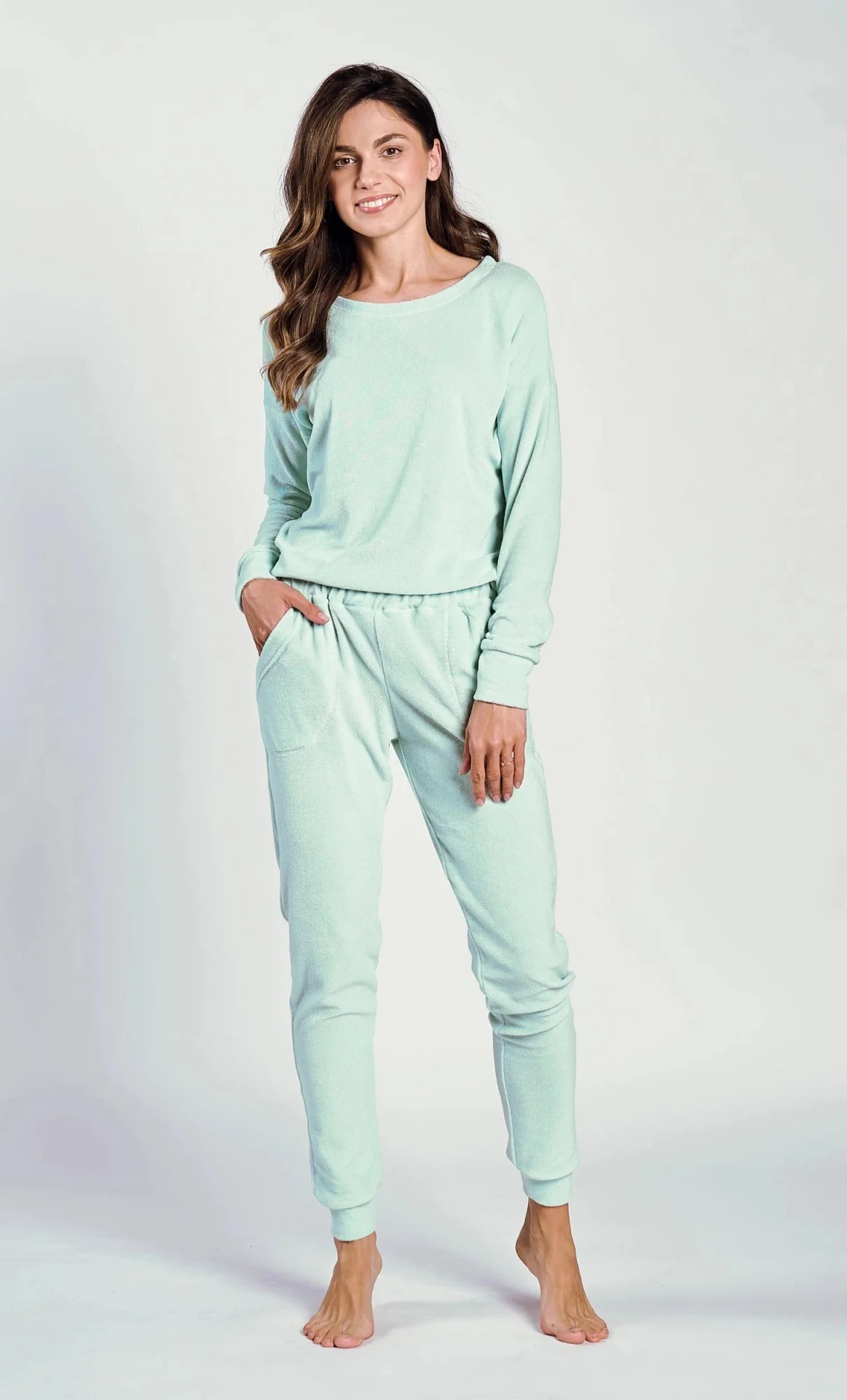 Dámské pyžamo 3243 Jessie TARO - z vysoce jakostní froté bavlny - tričko zelené barvy s dlouhými rukávy - zelené dlouhé kalhoty s kapsami na bocích - rukávy i nohavice zakončené žebrovaným lemováním