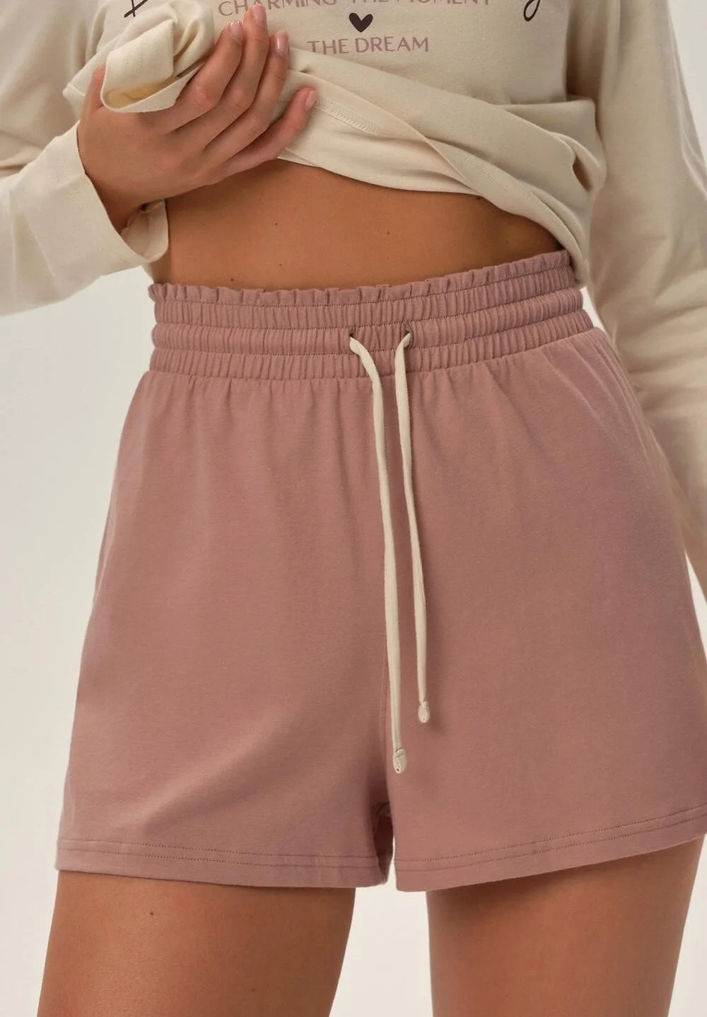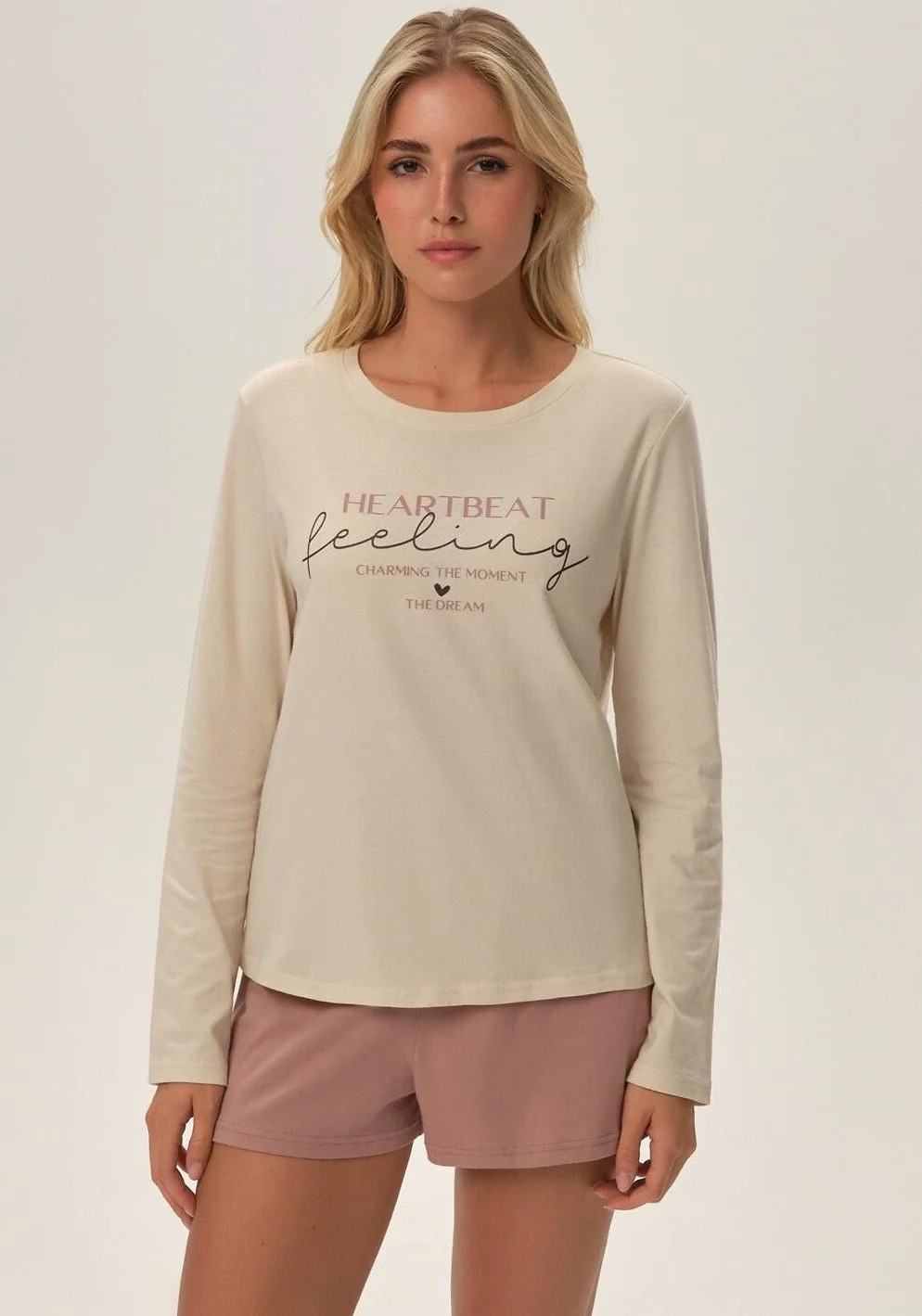 Dámské pyžamo od značky Henderson. Vrchní díl pyžama má dlouhý rukáv, kulatý výstřih a potisk uprostřed. Šortky jsou jednobarevné, bez kapes a v pase mají pohodlnou pružnou gumu se šňůrkou. Pyžamo je ušité z lehké příjemné bavlny.