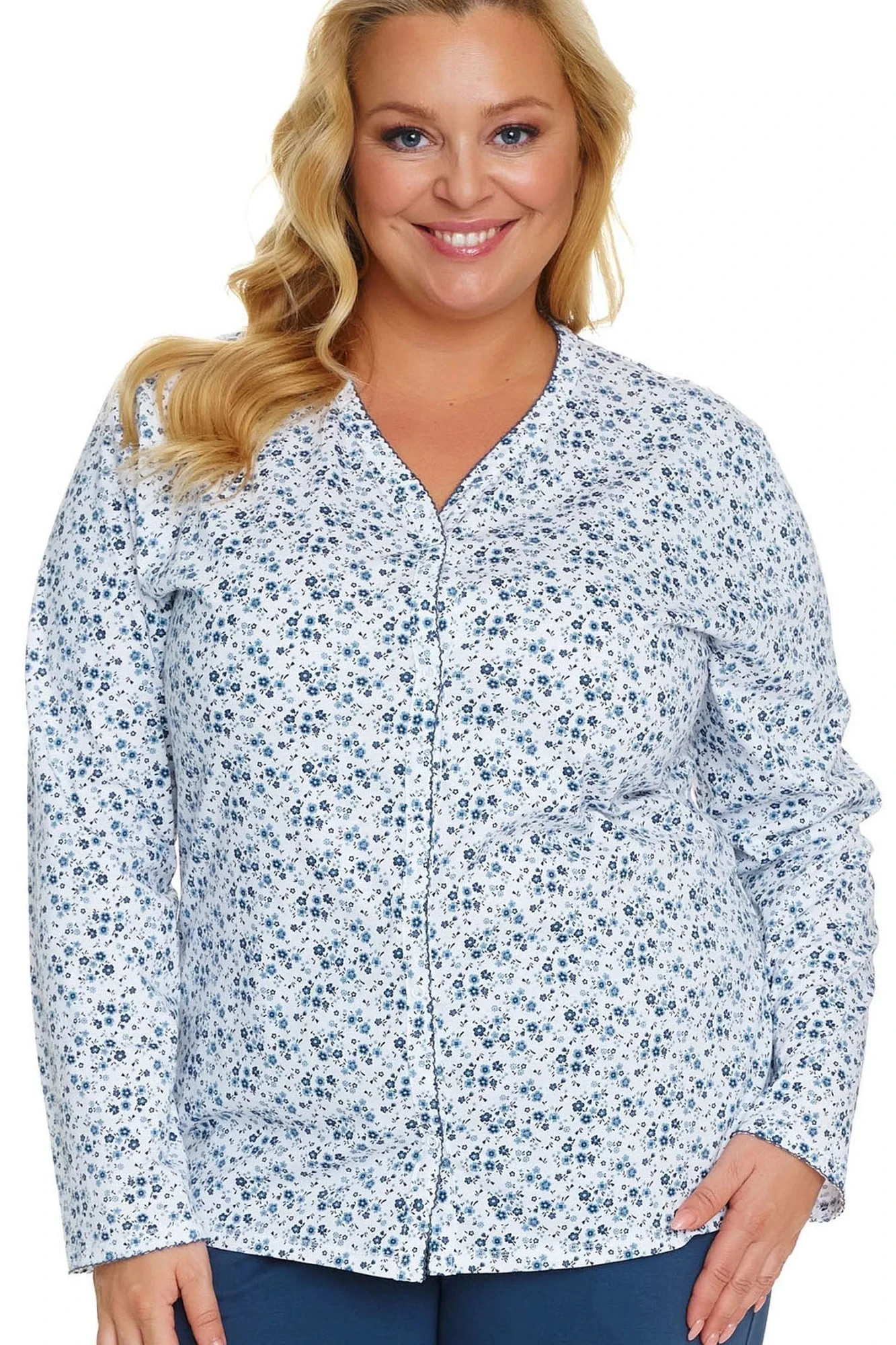 Dámské pyžamo 5282 blue Doctornap - z vysoce jakostní bavlny - bílá košile na zapínání a s dlouhými rukávy - s modrým květinovým potiskem - dlouhé modré kalhoty s kapsami - certifikát OEKO-TEX Standard 100