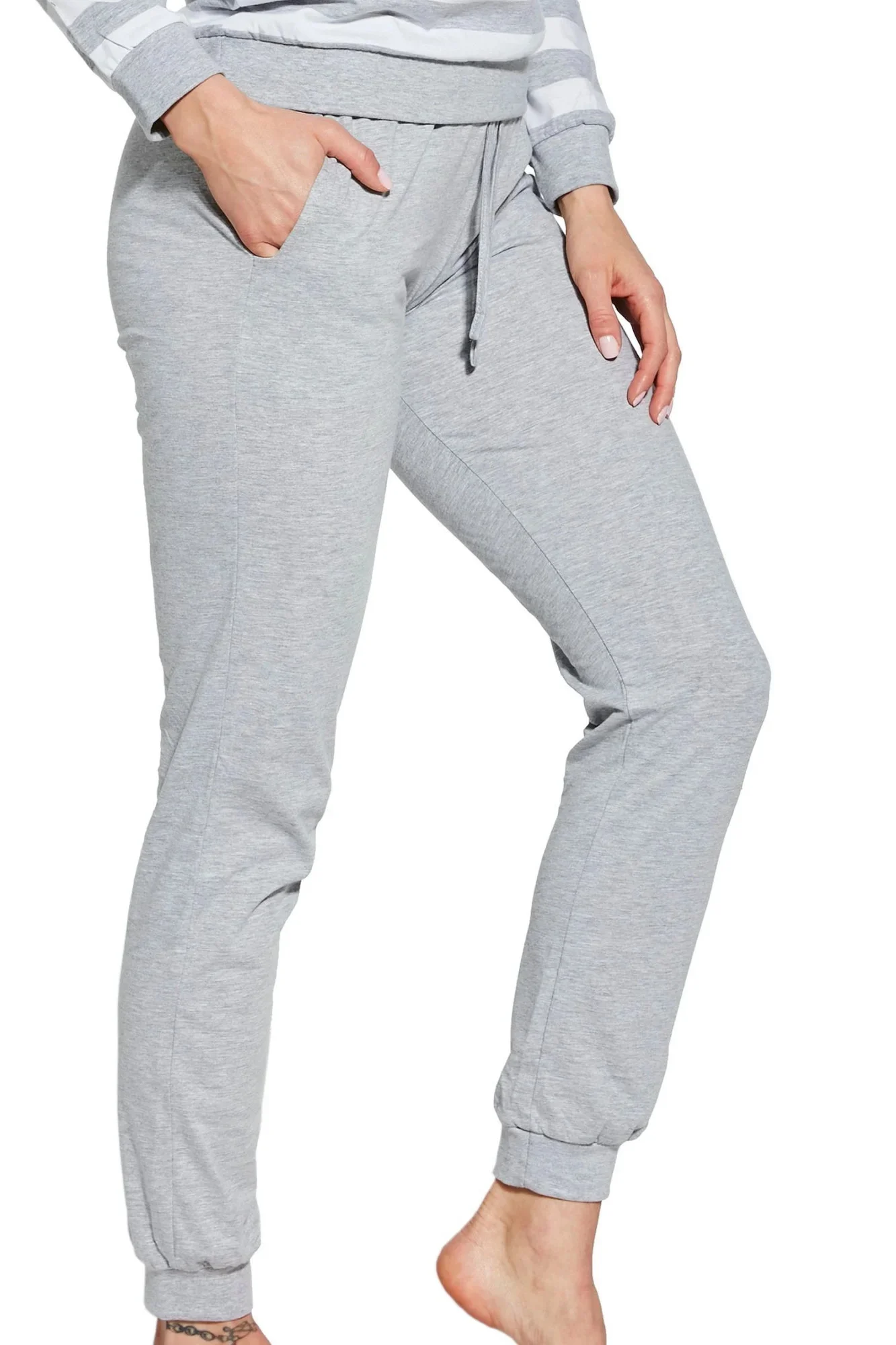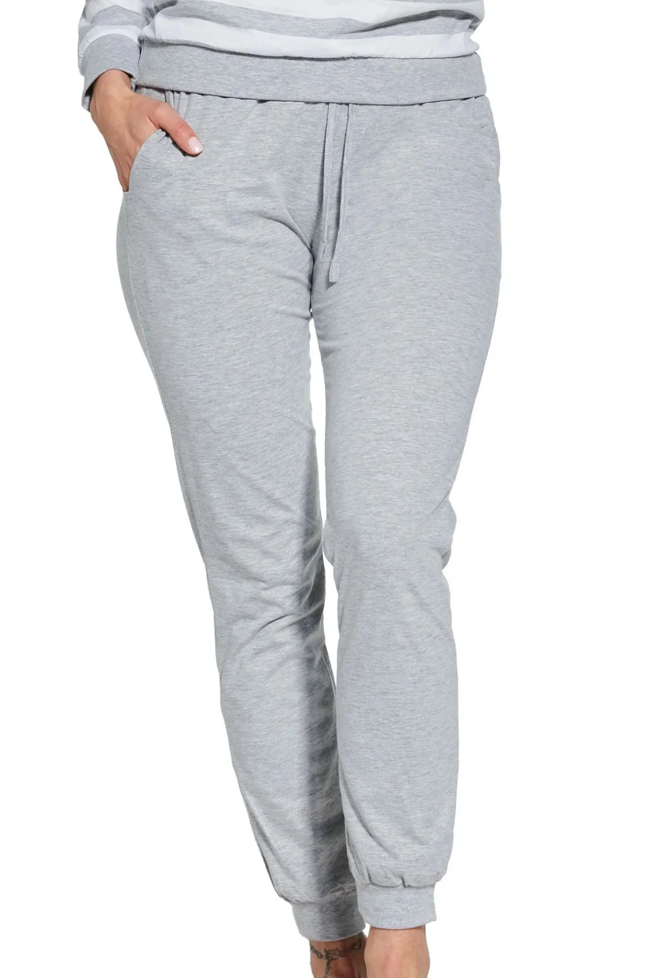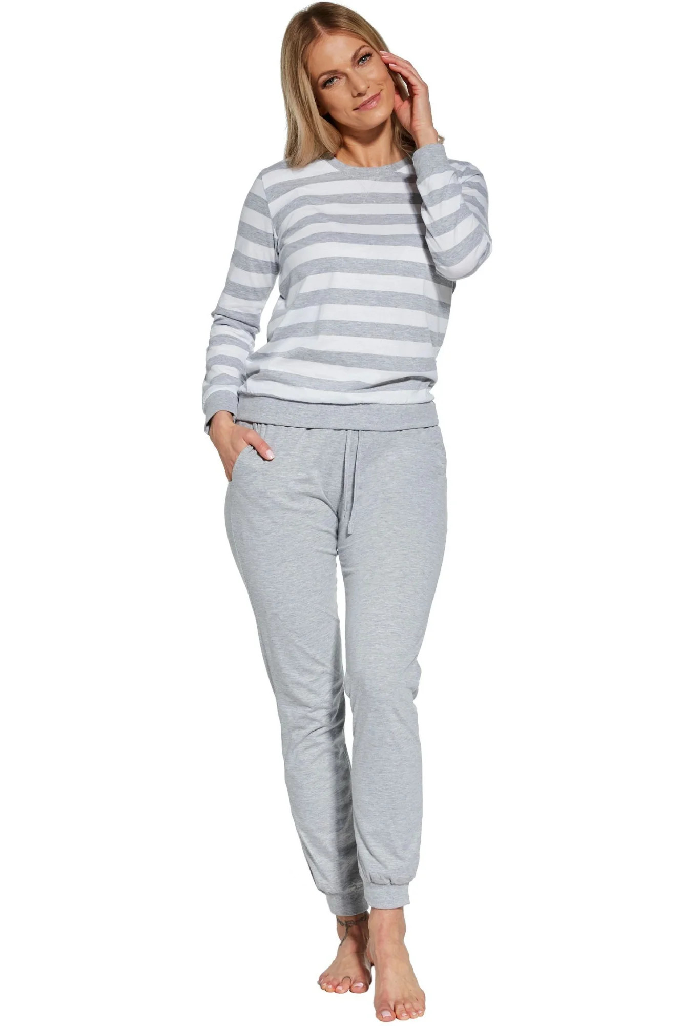 Dámské pyžamo 634/30 Molly CORNETTE - z vysoce kvalitní a na dotyk příjemné bavlny - bílo-šedé pruhované tričko s dlouhými rukávy - dlouhé šedé kalhoty s kapsami