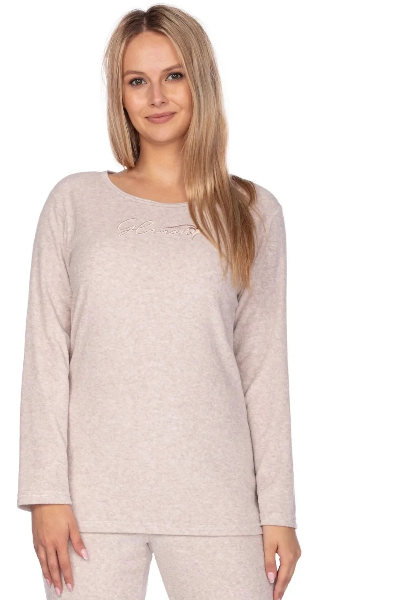 Dámské pyžamo 643 beige REGINA - z vysoce jakostní froté bavlny - béžové tričko s dlouhými rukávy - na přední straně zdobené nášivkou - dlouhé jednobarevné kalhoty béžové barvyMateriálové složení: 80% bavlna + 20% polyester