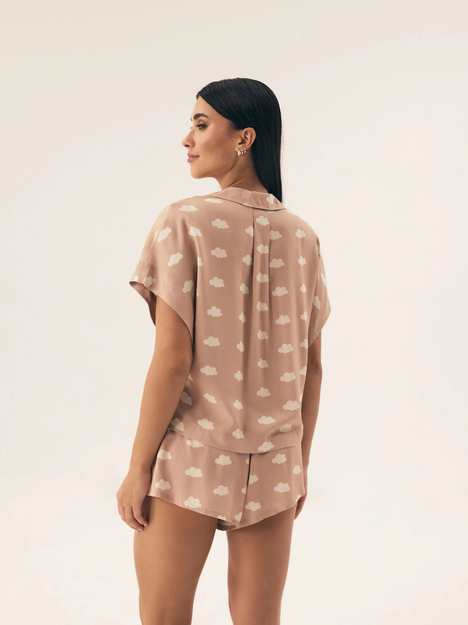 Dámské pyžamo 42645 Nubes HENDERSON - z vysoce jakostní bavlny - béžová košile s krátkými rukávy - zapínání na knoflíky - jednobarevné kraťasy - zdobené potiskem bílých mráčků - široký elastický pás