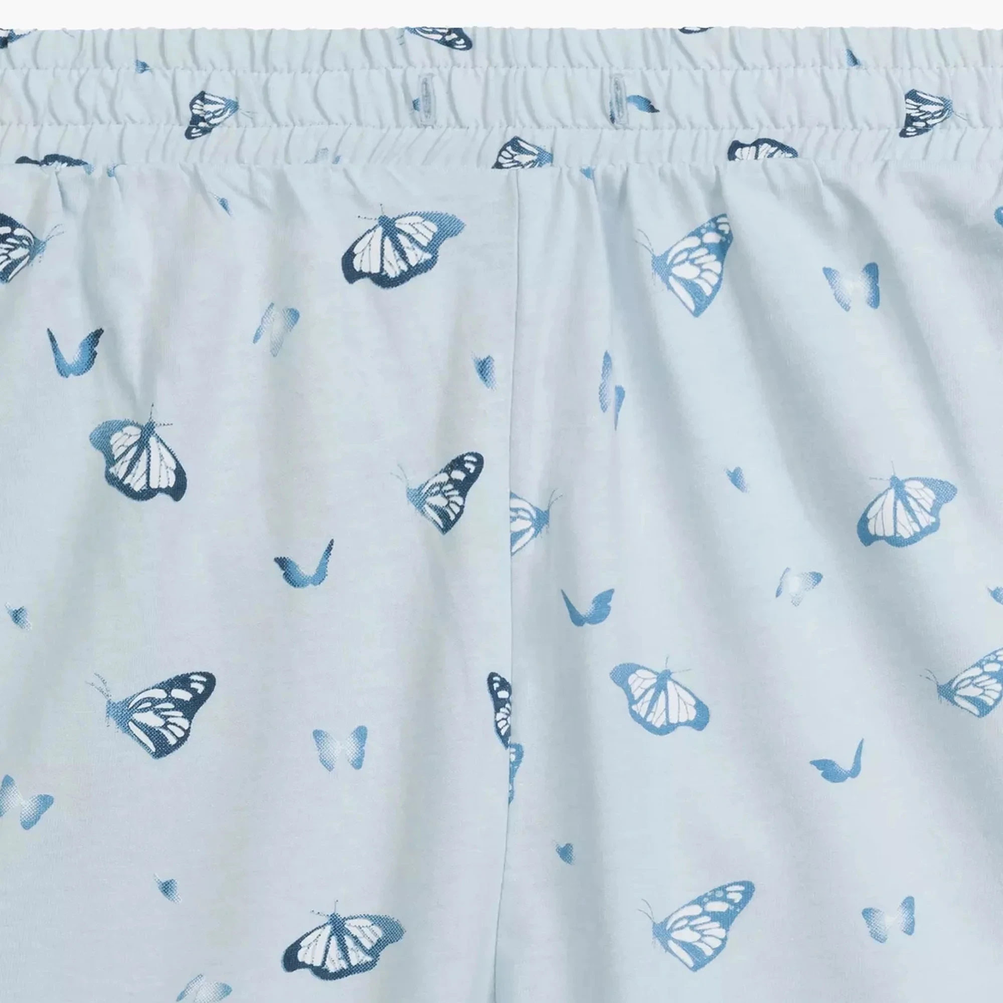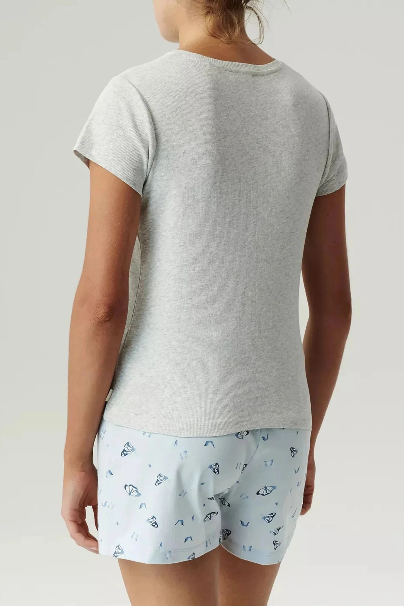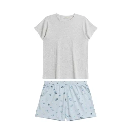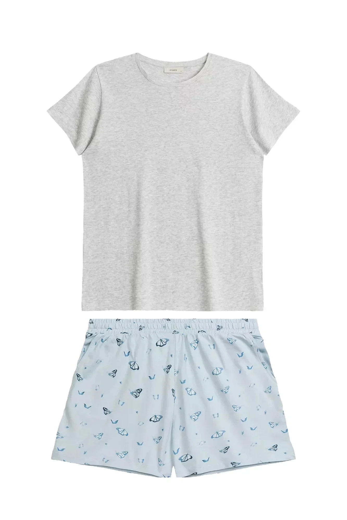 Dámské pyžamo 490/02 grey Atlantic - z vysoce jakostní bavlny - šedé tričko s krátkými rukávy - vzorované šortky světle modré s kapsami - maximální komfort nošení - hodí se i jako domácí relaxační set