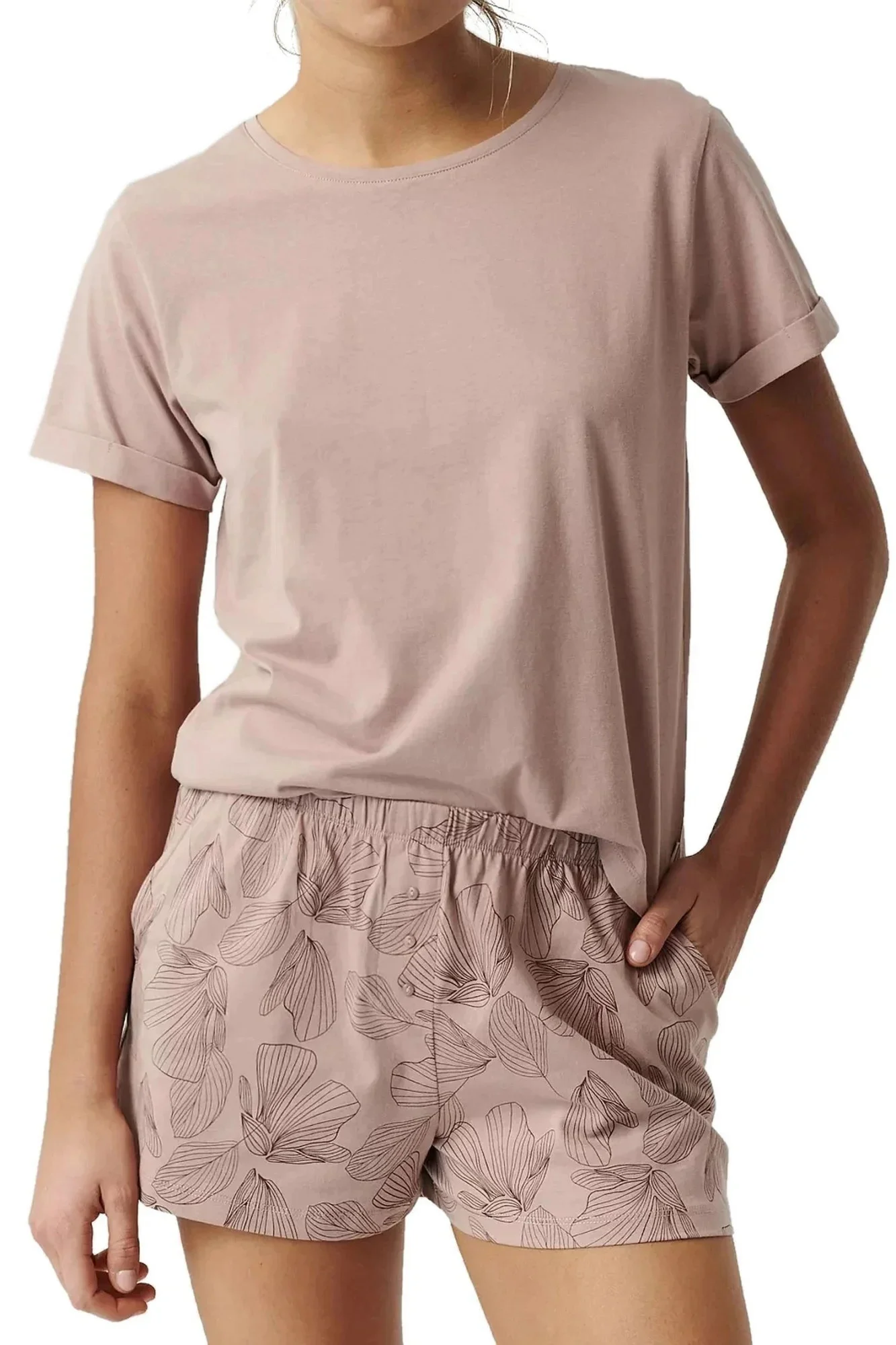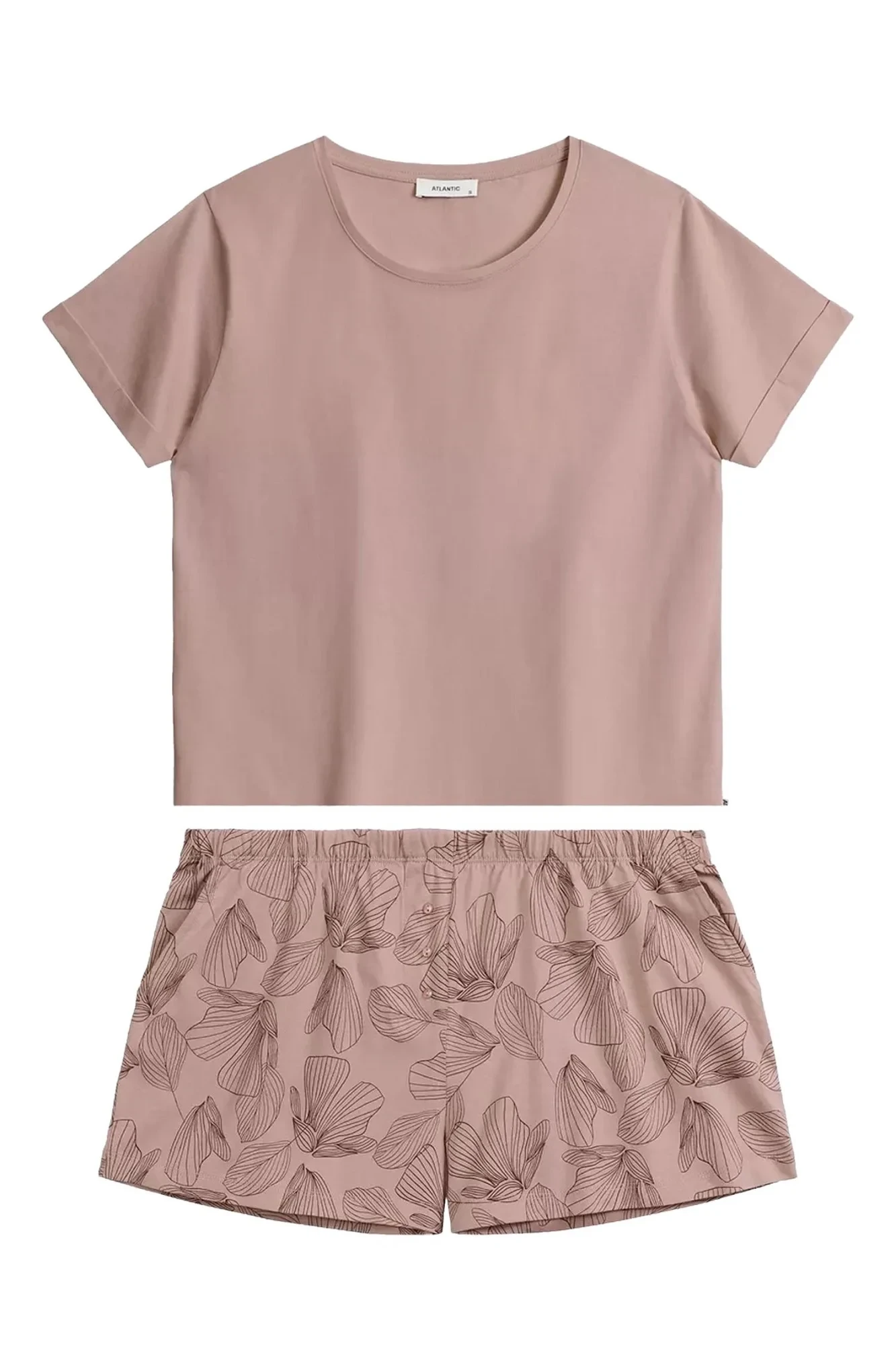 Dámské pyžamo 489 powder Atlantic - z vysoce jakostní bavlny - starorůžové tričko s krátkými rukávy - vzorované šortky s kapsami - široký elastický pas - prodyšná látka, která dobře odvádí vlhkost - střih zajišťující pohodlí a volnost pohybu - kvalitní bavlna příjemné na dotek a šetrná k pokožce