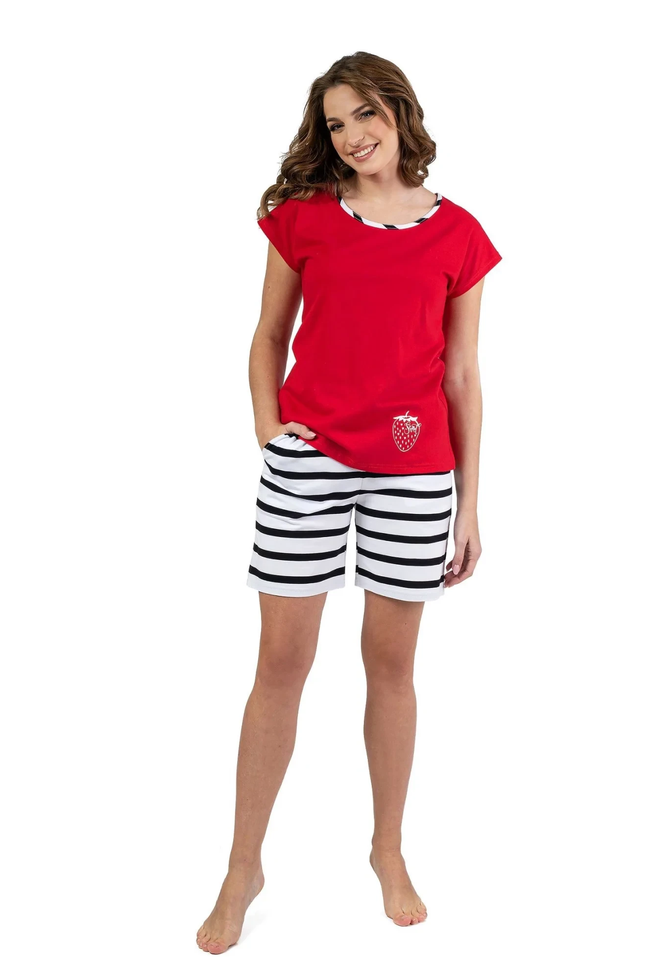 Dámské pyžamo 697 red REGINA - z vysoce jakostní bavlny - červené tričko s krátkými rukávy - kulatý výstřih s pruhovaným lemováním - zdobené potiskem na přední straně - pruhované šortky