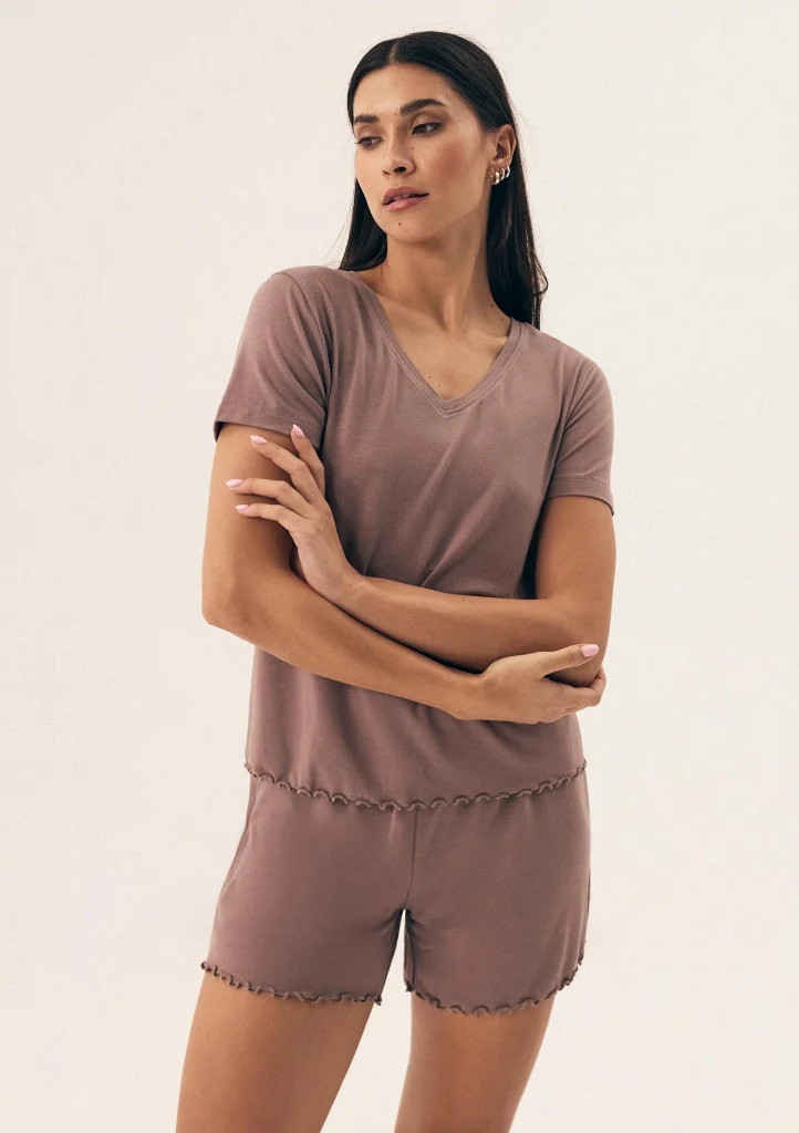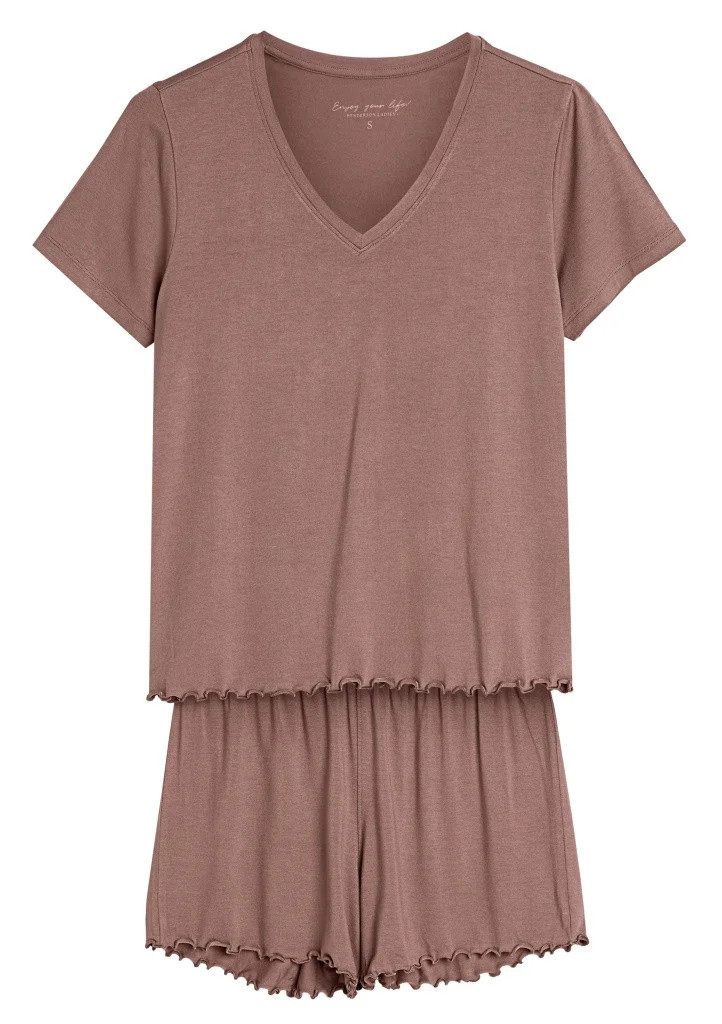 Dámské pyžamo od značky Henderson je skvělou volbou pro pohodlný spánek i domácí lenošení. Pyžamo se skládá z trička s krátkým rukávem a výstřihem do V a šortek, které jsou v pase na širokou pružnou gumu pro maximální komfort. Spodní lem trička i nohaviček šortek je ozdoben jemným vlnkovaným zakončením, které dodává celému kompletu ženský a elegantní vzhled. Díky příjemnému materiálu je pyžamo měkké a pohodlné na nošení.