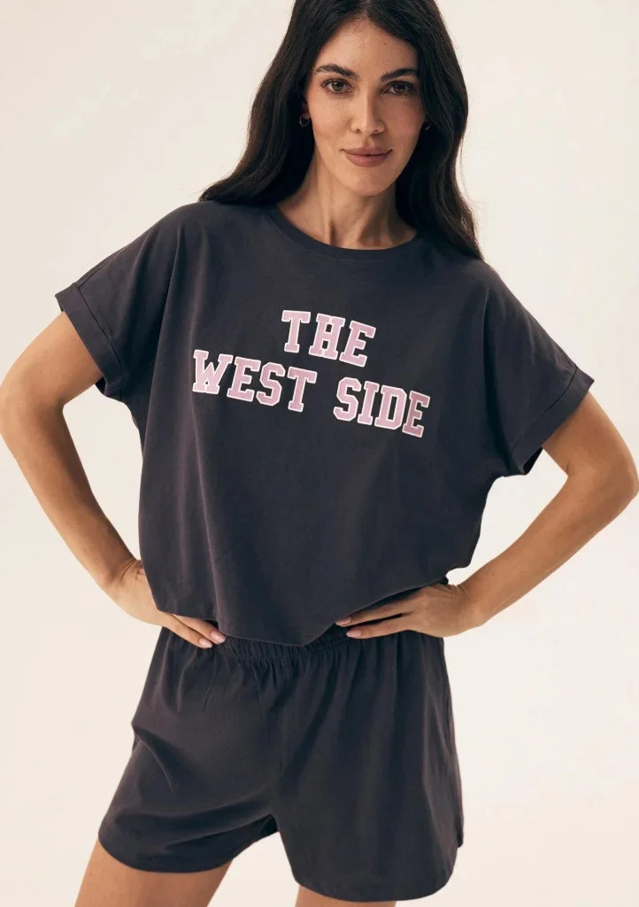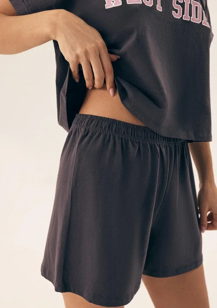 Dámské pyžamo od značky Esotiq v nadčasovém stylu pro všechny, kdo zakládají na každodenním pohodlí. Pyžamo se skládá z kratšího trička a šortek, které spolu tvoří pohodlný a stylový komplet ideální na spaní i domácí pohodu. Tričko s krátkým rukávem má na přední straně pogumovaný nápis, šortky jsou v pase na pohodlnou pružnou gumu. Díky bavlněnému materiálu je pyžamo velmi měkké a příjemné na dotek.