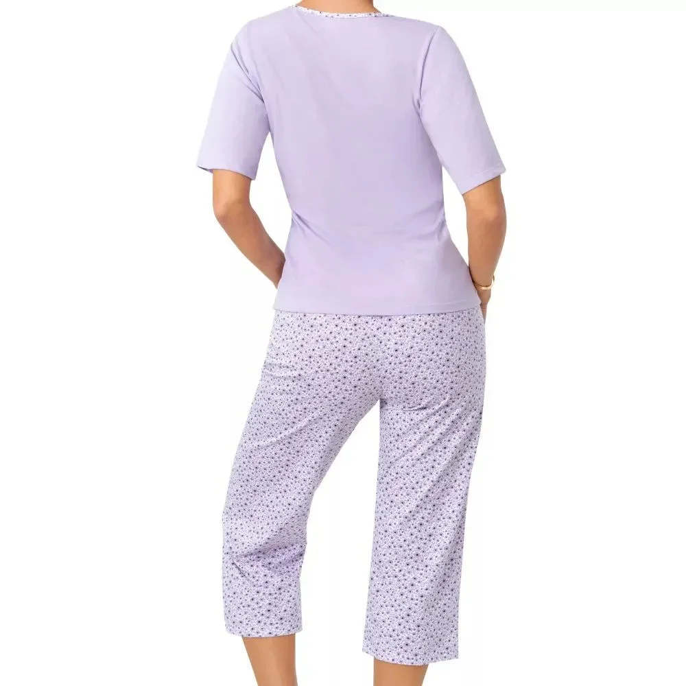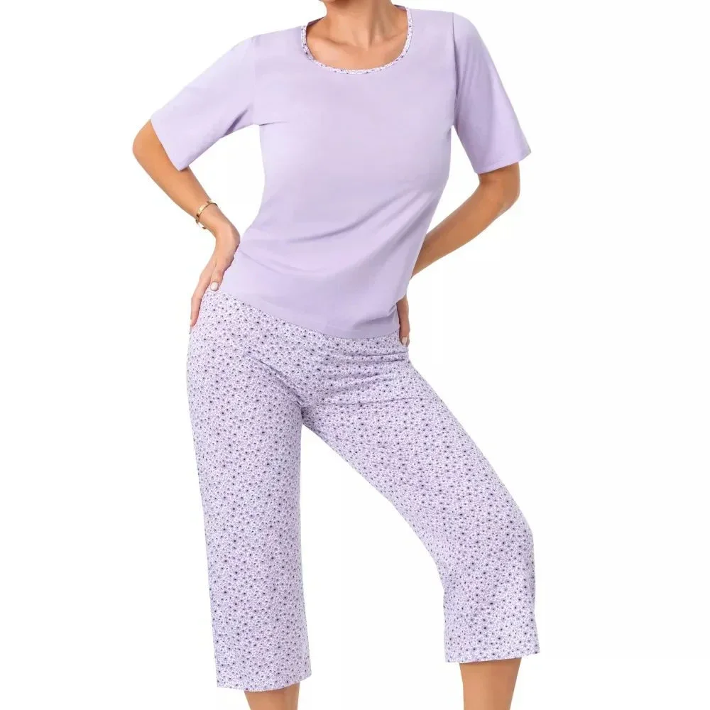 Dámské pyžamo Fiorella 3/4 Donna - z vysoce jakostní bavlny - fialové tričko s krátkými rukávy - vzorované kalhoty