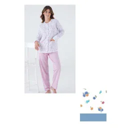 Dámské bavlněné pyžamo značky Karelpiu. Pyžamo se skládá z kabátku s dlouhým rukávem, je celopropínací na knoflíky. Rukávy jsou ukončené volně. Kalhoty jsou v pase do pružné obšité gumy. Pyžamo je ušité z příjemné lehké bavlny.