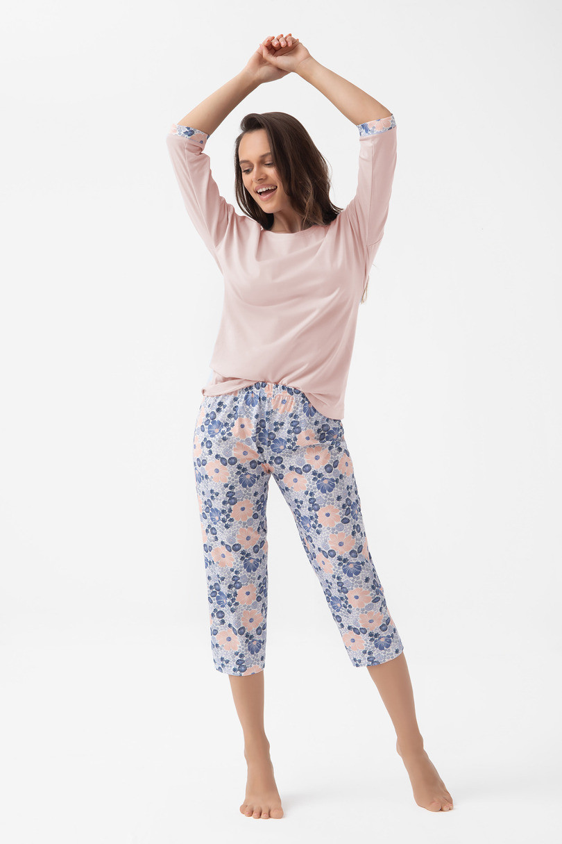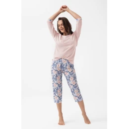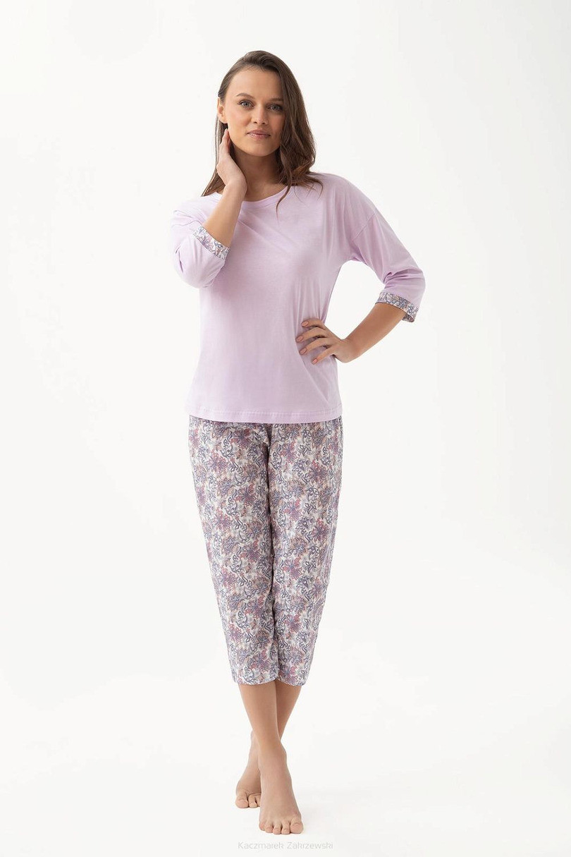 Dámské pyžamo Luna 343 J/25 je kombinací klasického a moderního designu. Jednobarevný top (vřesový nebo krémový) má kulatý výstřih a 3/4 rukávy s manžetami z potištěného úpletu, které navazují na vzor kalhot. 3/4 kalhoty jsou rovněž potištěné, což celku dodává harmonický vzhled. Komplet ze 100% bavlny zaručuje přirozenou prodyšnost a vysokou úroveň pohodlí při spánku. Ideální pro všechna roční období.