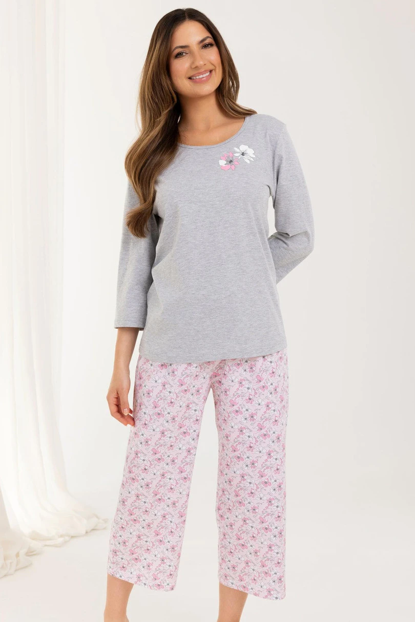 Piżama damska 711 BIG J/25 to komfortowy i stylowy zestaw stworzony z myślą o kobietach ceniących wygodę oraz subtelny design. Wykonana w całości z wysokiej jakości bawełny, zapewnia oddychalność i miękkość przy każdym ruchu. Koszulka z rękawem 3/4, półokrągłym dekoltem i kwiatowym nadrukiem z przodu prezentuje się kobieco i elegancko. Całość uzupełniają wzorzyste spodnie o długości 3/4 – idealne na wiosnę i lato.