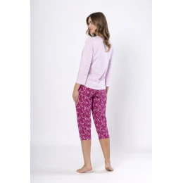 EDYTA 1633 marki Leveza to komfortowa piżama damska stworzona z myślą o kobietach ceniących wygodę i delikatny styl. Wykonana w 100% z naturalnej bawełny, zapewnia maksymalny komfort podczas snu i relaksu. Górna część to bluzka z okrągłym dekoltem, rękawem 7/8 oraz subtelnym nadrukiem kwiatowym na tle koloru lilaróż. Spodnie 3/4 w intensywnym odcieniu amarantu zdobi roślinny wzór z motywem listków, który nadaje całości nowoczesnego charakteru. Lekki i oddychający komplet dostępny jest w rozmiarach od M do 2XL – idealny wybór na każdą porę roku.