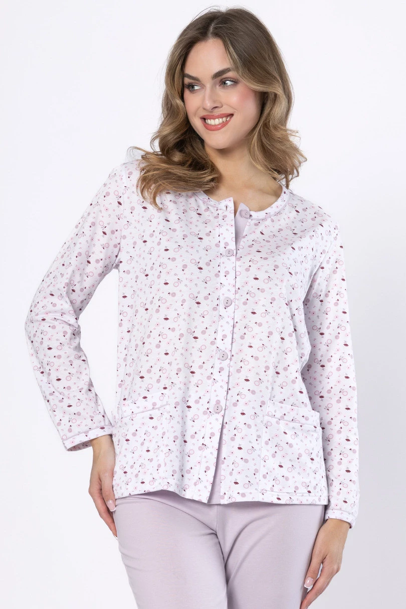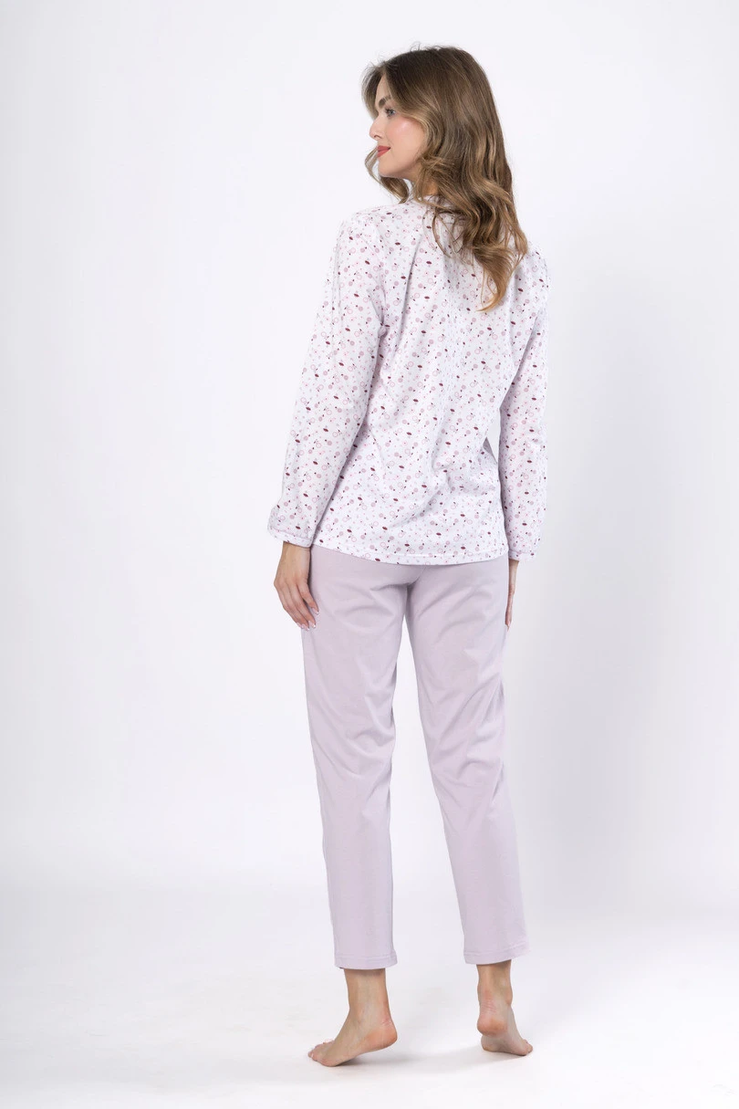 Piżama damska DANUTA 1637 od marki Leveza to stylowy i praktyczny wybór dla kobiet ceniących klasykę, komfort i delikatne detale. Wykonana w 100% z miękkiej, oddychającej bawełny, gwarantuje wygodę przez całą noc. Rozpinana bluzka z długim rękawem zakończonym mankietem posiada okrągły dekolt, praktyczne kieszenie oraz subtelne wykończenie w postaci kontrastowej taśmy. Delikatny wzór drobnych kwiatków w połączeniu z białym i liliowym kolorem nadaje całości kobiecego uroku. Do zestawu dołączone są liliowe spodnie 7/8, które idealnie komponują się z górą. Piżama dostępna w rozmiarach od M do 2XL.