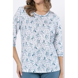 Postaw na komfort i kobiecy styl z piżamą BENITA 1640 od marki Leveza. Wykonana w 100% z wysokogatunkowej bawełny, gwarantuje naturalną przewiewność i miękkość, które idealnie sprawdzą się podczas snu i wieczornego relaksu. Górna część piżamy to bluzka z rękawem 3/4, ozdobiona kontrastowymi wypustkami i uroczo zdobiona motywem ptaszków. Morsko-biała kolorystyka dodaje świeżości i lekkości. Spodnie o długości 3/4 w jednolitym morskim kolorze dopełniają całości, zapewniając swobodę ruchów i wygodę użytkowania. Dostępna w rozmiarach od M do 2XL – idealna dla każdej kobiety, która ceni wygodę i estetykę.
