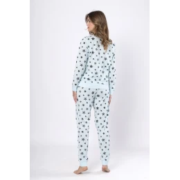 KINGA 1643 od marki Leveza to piżama damska typu homewear, stworzona z myślą o wygodzie i swobodzie w domowym zaciszu. W całości wykonana z 100% naturalnej bawełny, zapewnia oddychalność, komfort i przyjemne dopasowanie do ciała. Górna część zestawu to bluzka z okrągłym dekoltem, długim rękawem zakończonym ściągaczami, utrzymana w kolorze baby blue i ozdobiona subtelnym wzorem nieregularnych gwiazd. Do kompletu dołączone są długie spodnie z kieszeniami, ściągaczami w nogawkach oraz EAN čárové kódy zboží jsou: