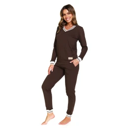 Piżama damska PM.4504 J/25 od renomowanego producenta Dr Nap to połączenie komfortu i modnego designu, które sprawdzi się nie tylko jako piżama, ale również jako wygodny komplet typu homewear. Koszulka z długim rękawem oraz dekoltem w kształcie litery V, ozdobiona kontrastowym ściągaczem w kolorze białym, czerwonym i srebrnym, dodaje stylu i podkreśla kobiecy charakter.