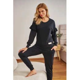 Piżama damska PM.4351 J/25 marki Dr Nap to wyjątkowo kobiecy komplet typu homewear, łączący w sobie wygodę bielizny nocnej z funkcjonalnością odzieży codziennej. Wykonana w 100% z miękkiej, oddychającej bawełny, idealnie sprawdzi się zarówno podczas snu, jak i w ciągu dnia. Górna część piżamy została ozdobiona falbankami na rękawach, które nadają całości lekkości i subtelnego uroku. Fason podkreśla kobiecą sylwetkę, a kieszonki w spodniach dodają praktycznego charakteru.