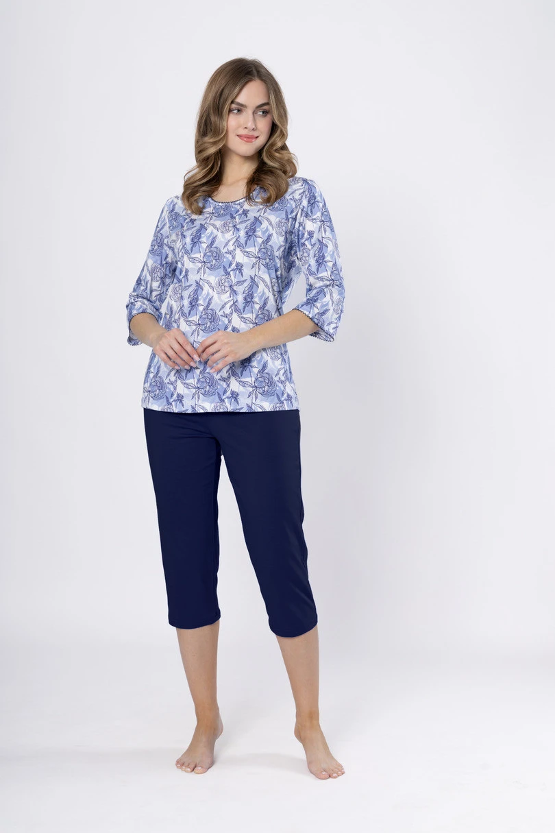 Dámské pyžamo Leveza Ewell 1661 je elegantní prémiová souprava navržená pro ženy, které si cení pohodlí a stylu. Je vyrobeno výhradně z ušlechtilé přírodní bavlny, je prodyšné, měkké a šetrné k pokožce. Halenku v džínové barvě s kulatým výstřihem a 3/4 rukávy zdobí jemný květinový vzor a ozdobné prošívání v rozkroku, které působí decentně, zatímco 3/4 dlouhé kalhoty s rybím copem v jednobarevné tmavě modré barvě dotvářejí stylový a pohodlný komplet. K dostání ve velikostech M–2XL, ideální pro všechna roční období.