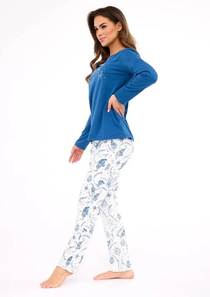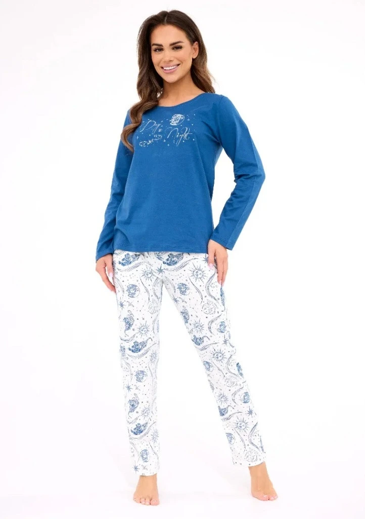 Dámské pyžamo značky Cornette inspirované kosmem má tričko s dlouhým rukávem a kulatým výstřihem. Kalhoty jsou dlouhé se vzorem po celé délce. Pyžamo je ušité z příjemné a prodyšné bavlny vhodné pro pohodlný spánek. Kalhoty jsou v pase do pružné obšité gumy pro maximální komfort. Souprava je zabalena v elegantní krabičce, vhodné i jako dárek.