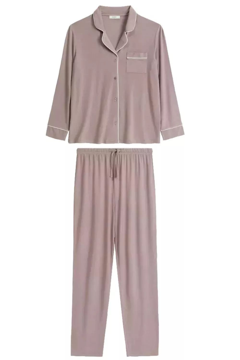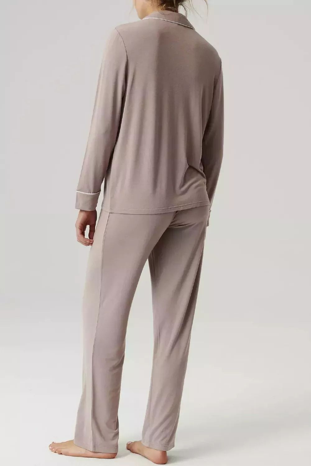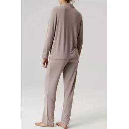 Dámské pyžamo 495 beige Atlantic - z vysoce jakostní bavlny - béžová košile s dlouhými rukávy - s límečkem - na přední straně ozdobená kapsičkou - zapínání na knoflíky - dlouhé béžové kalhoty - nastavitelná guma v pase