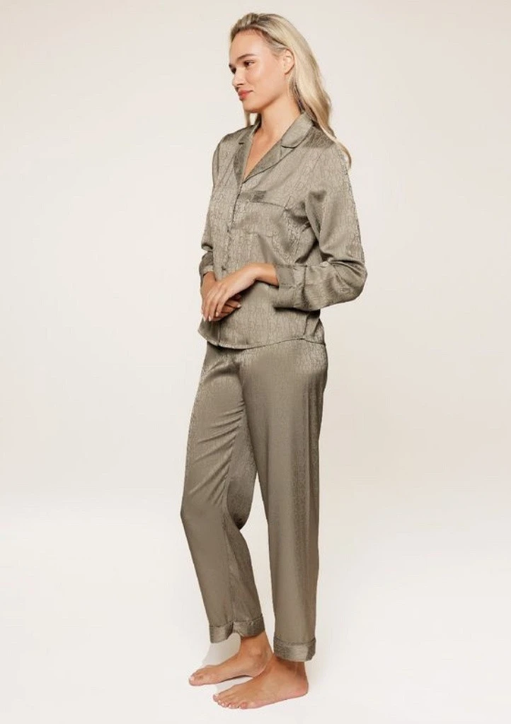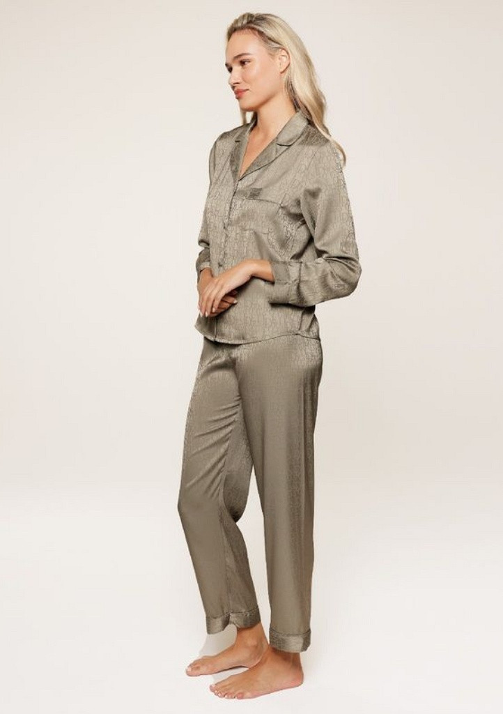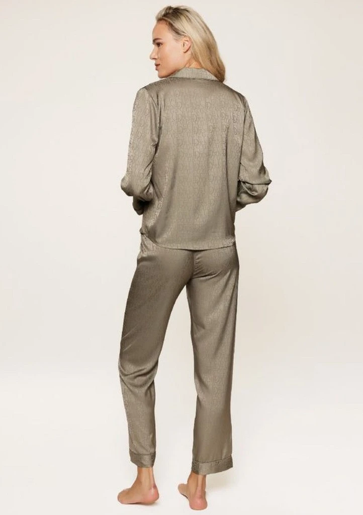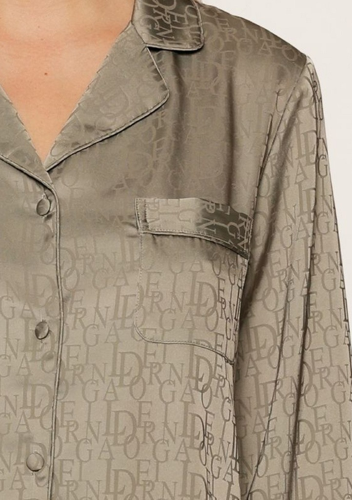 Dámská luxusní pyžamová sada složená z dlouhých kalhot a halenky s dlouhým rukávem, vyrobená z jemného saténového materiálu, který působí hedvábně na dotek a zajišťuje pohodlí při nošení. Halenka má zapínání na knoflíky po celé délce a na přední straně náprsní kapsičku. Kalhoty disponují elastickým pasem pro pohodlné nošení a rovnými nohavicemi pro elegantní vzhled. Po celé ploše pyžama je tištěné logo „LD“ v tónu barvy pyžama.