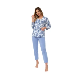 Górna część piżamy to rozpinana bluzka z rękawem 7/8, ozdobiona subtelnym, kwiatowym wzorem, który dodaje jej kobiecego charakteru. Praktyczne zapięcie na guziki zapewnia wygodę użytkowania oraz ułatwia zakładanie.