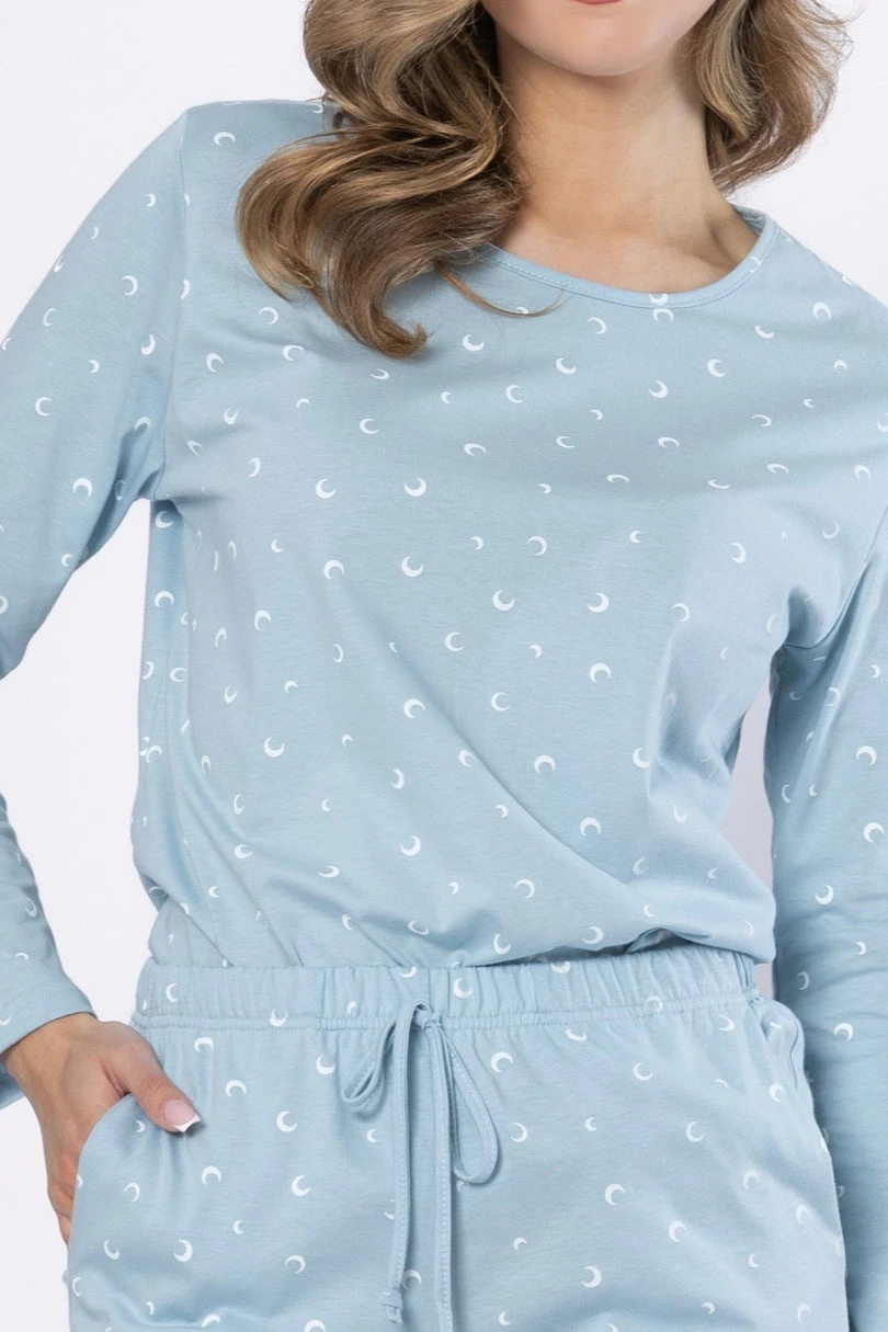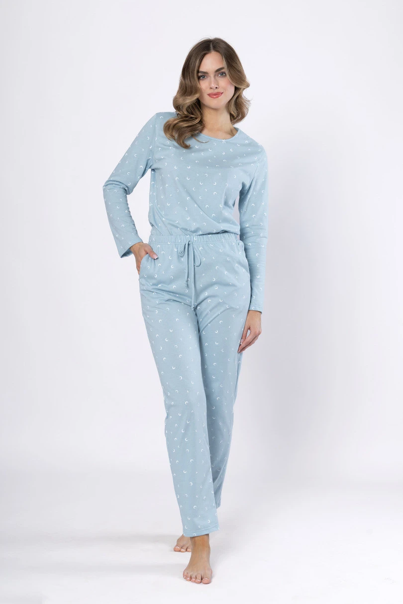 Dámské pyžamo MARTA 1646 značky LEVEZA je spojením pohodlí, kvality a jedinečného designu. Je vyrobeno ze 100% měkké, prodyšné bavlny a zaručuje pohodlí po celou noc. Blůza s kulatým výstřihem, dlouhými rukávy a jemným vzorem nepravidelných měsíčkůóv azurové barvě dodává originální nádech. Kalhoty s dlouhou nohavicí, praktickými kapsami a ozdobnou šňůrkou v pase zajišťují naprostou volnost pohybu.