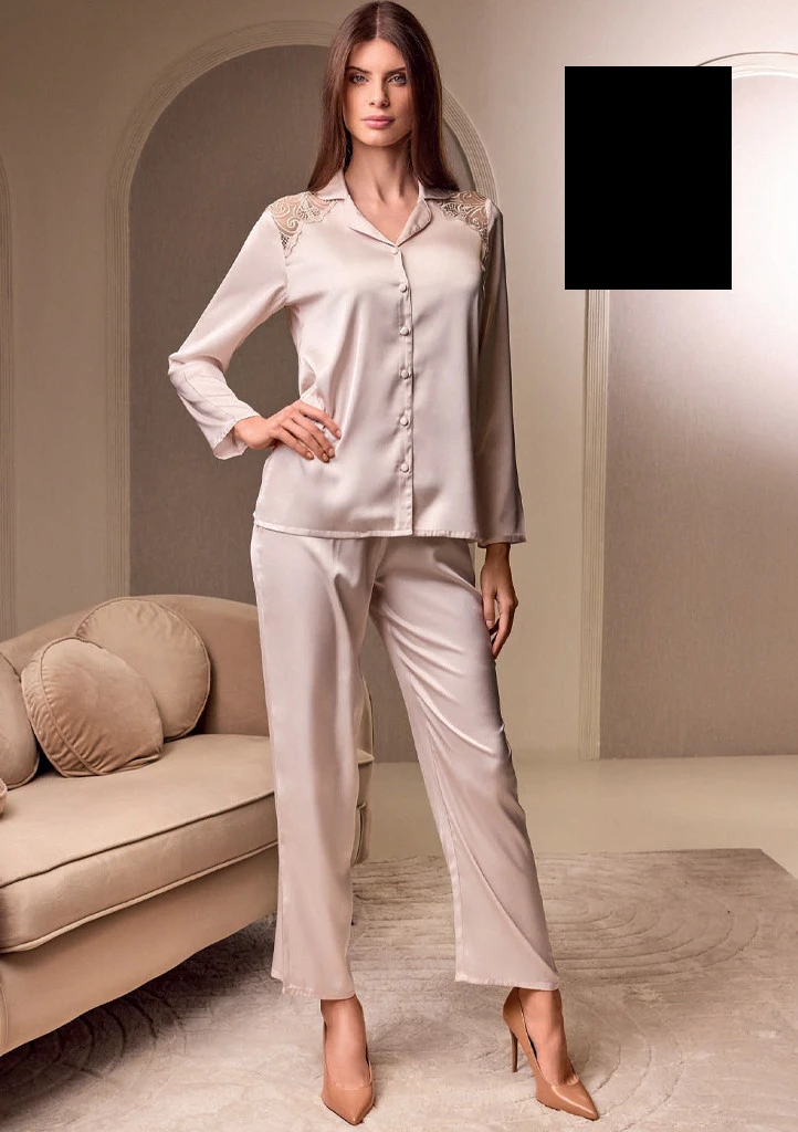 Dámské saténové pyžamo Lormar spojuje eleganci, jemnost a luxusní provedení. Horní díl má klasický střih na knoflíky a zdobí jej nádherná krajka v oblasti ramen, která celému modelu dodává sofistikovaný a velmi ženský vzhled. Kalhoty mají pohodlný rovný střih a působí lehce a vzdušně. Saténový materiál je příjemný na dotek, krásně se leskne a působí slavnostně. Ideální volba pro ženy, které mají rády komfort i styl v jednom.