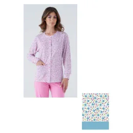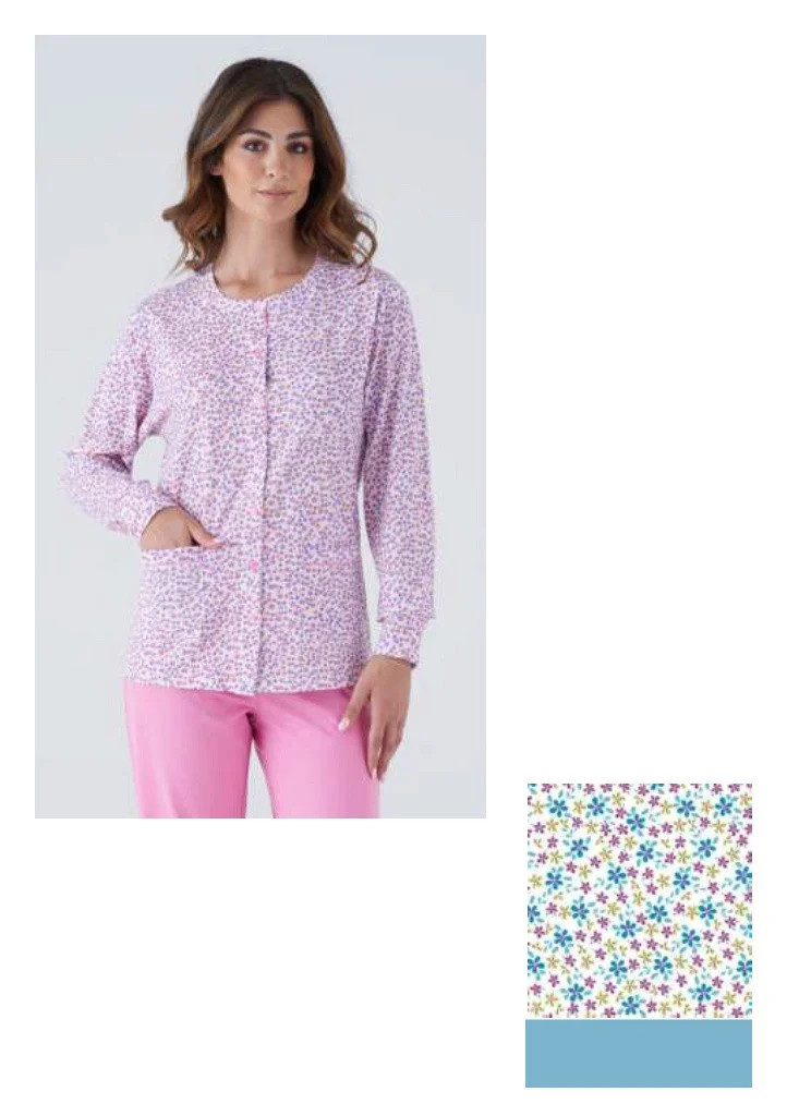 Dámské bavlněné pyžamo značky Karelpiu. Pyžamo se skládá z kabátku s dlouhým rukávem, je celopropínací na knoflíky. Rukávy jsou ukončené volně. Kalhoty jsou v pase do pružné obšité gumy. Pyžamo je ušité z příjemné lehké bavlny.
