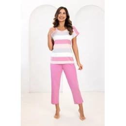 Komfortowa piżama damska o klasycznym, uniwersalnym stylu, stworzona z myślą o codziennym wypoczynku. Zestaw składa się z koszulki z krótkim rękawem ozdobionej poziomymi paskami w delikatnych, pastelowych odcieniach oraz gładkich spodni o długości 3/4. Luźny fason zapewnia swobodę ruchów i wygodę noszenia przez całą noc. Harmonijna kolorystyka nadaje całości spokojny, elegancki charakter, dzięki czemu piżama doskonale sprawdzi się zarówno do spania, jak i do relaksu w domowym zaciszu.