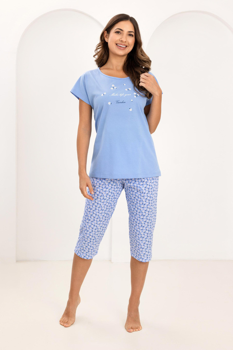 Wygodna piżama damska idealna do snu i domowego wypoczynku. Zestaw składa się z koszulki z krótkim rękawem w pastelowym kolorze, ozdobionej delikatnym nadrukiem na przodzie, oraz spodni o długości 3/4 z drobnym, subtelnym wzorem. Luźny, prosty krój zapewnia swobodę ruchów i komfort noszenia przez całą noc. Jasna, pastelowa kolorystyka nadaje całości świeżości i lekkości, sprawiając, że piżama doskonale sprawdzi się szczególnie w cieplejsze dni.